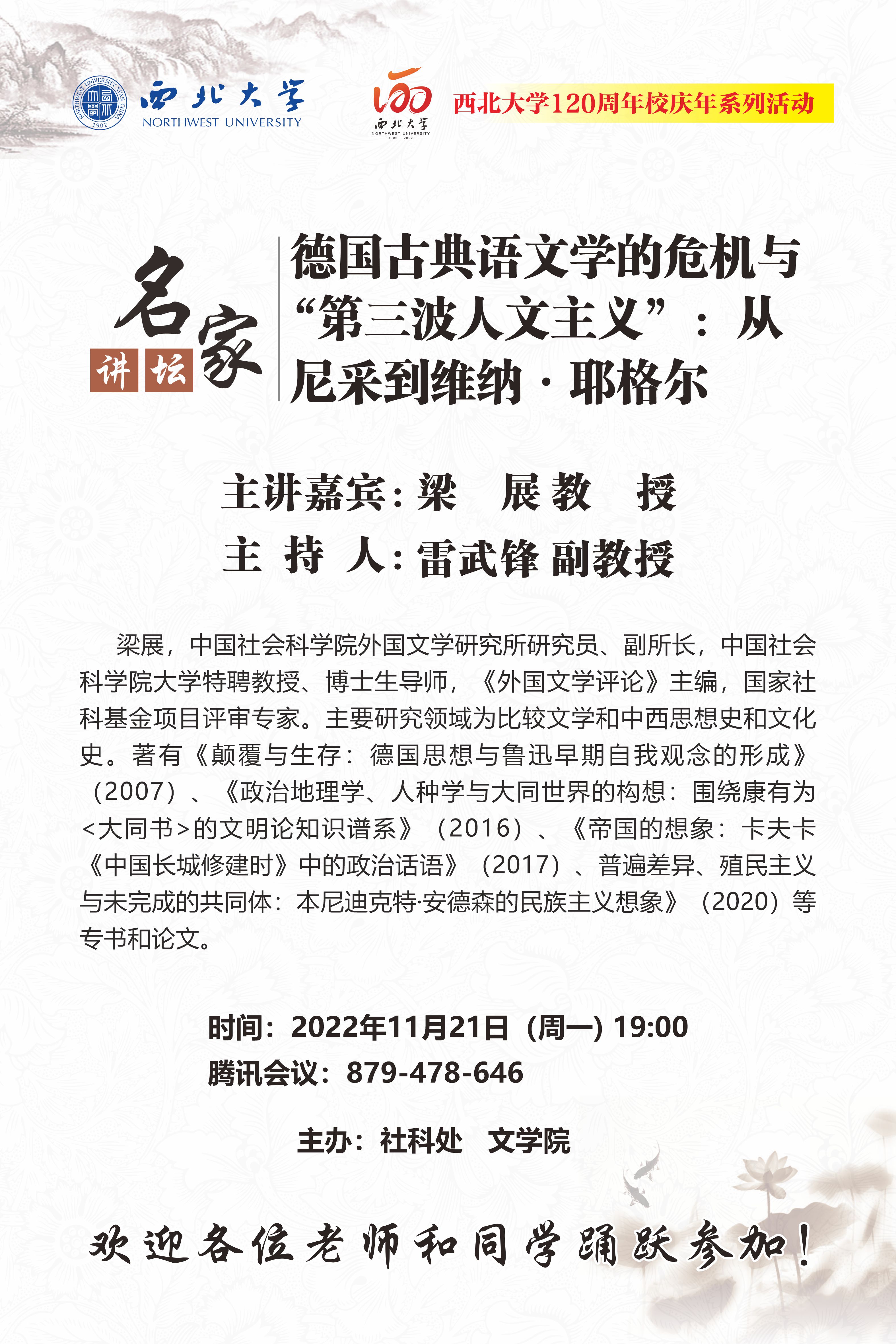 梁展 教授 名家讲坛暨120周年校庆年系列活动:德国古典语文学的危机与“第三波人文主义”:从尼采到维纳·耶格尔 讲座时间 2022年11月21日(周一)19:00 讲座地点 腾讯会议:879-478-646 讲座人介绍 梁展 教授 讲座内容