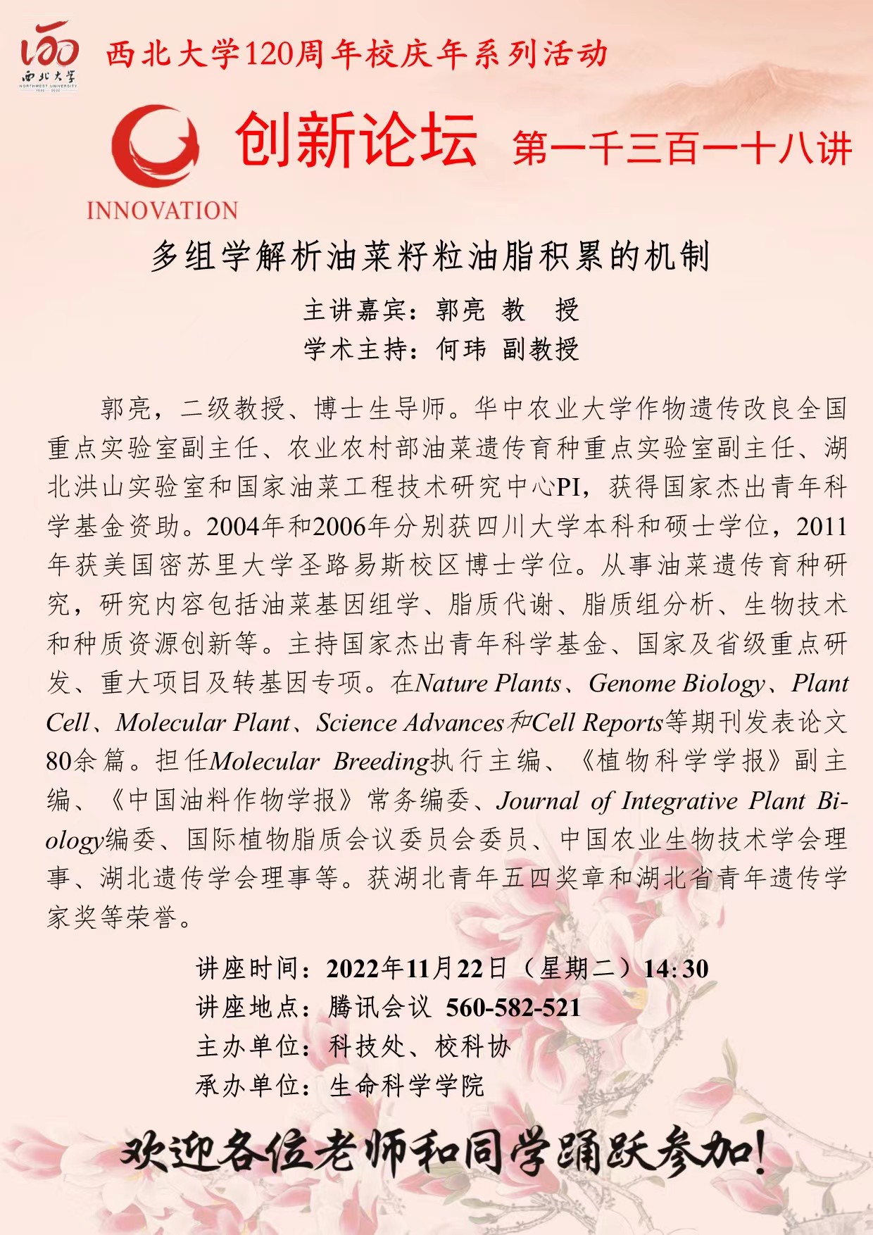郭亮 教授 开云手机网页版登录入口创新论坛第一千三百一十八讲暨120周年校庆年系列活动: 多组学解析油菜籽粒油脂积累的机制 讲座时间 2022年11月22日(星期二) 14:30 讲座地点 腾讯会议 560-582-521 讲座人介绍 郭亮 教授 讲座内容