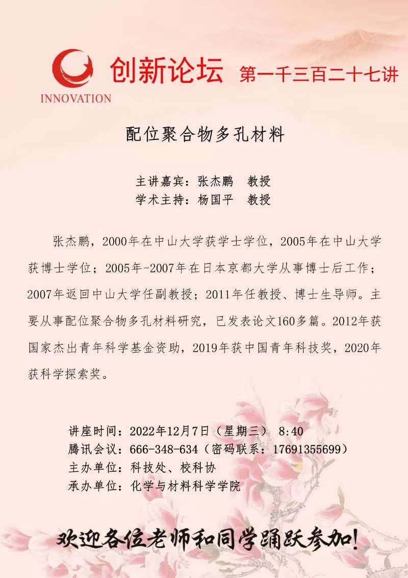 张杰鹏 教授 开云手机网页版登录入口创新论坛第一千三百二十七讲:配位聚合物多孔材料 讲座时间 2022年12月7日(星期三) 8:40 讲座地点 腾讯会议:666-348-634 讲座人介绍 张杰鹏 教授 讲座内容