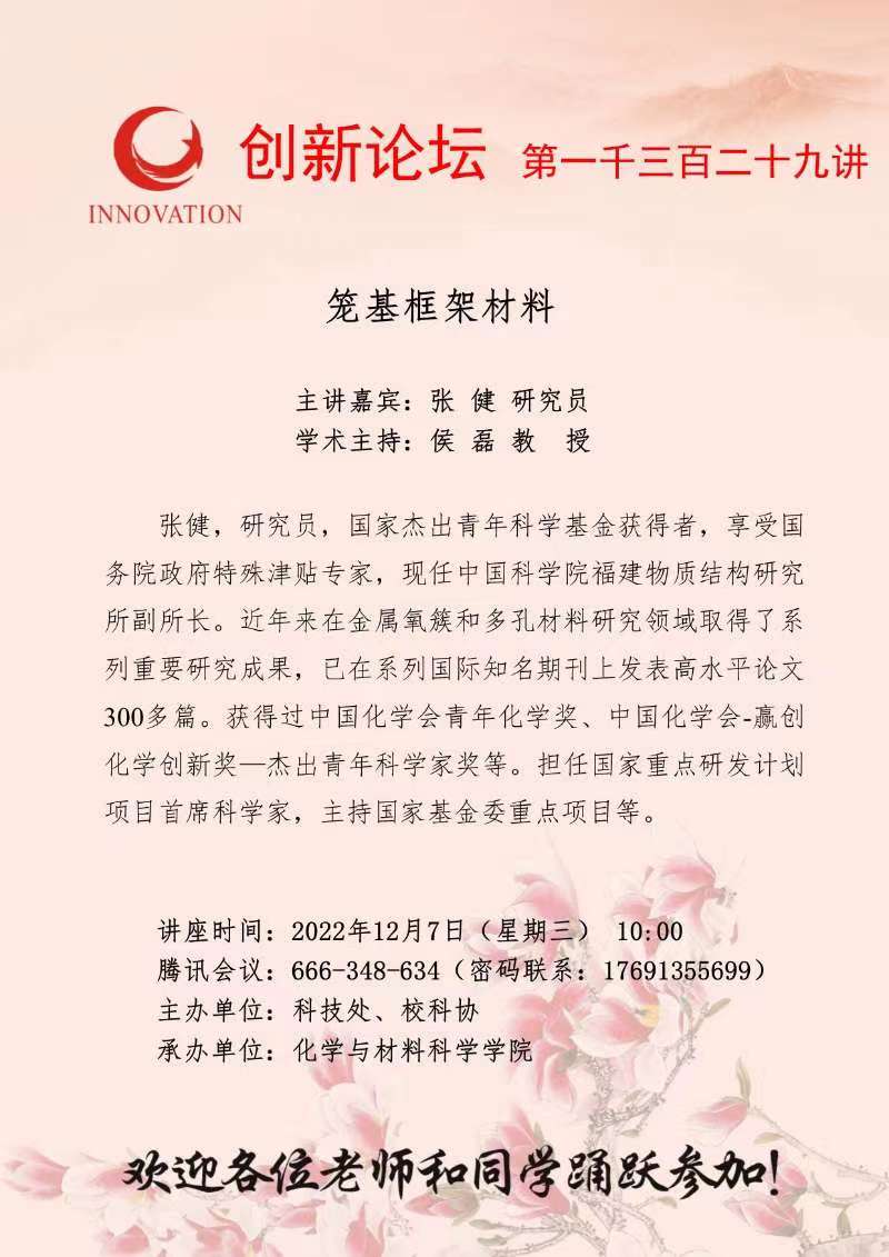 张健 研究员 开云手机网页版登录入口创新论坛第一千三百二十九讲:笼基框架材料 讲座时间 2022年12月7日(星期三) 10:00 讲座地点 腾讯会议:666-348-634 讲座人介绍 张健 研究员 讲座内容