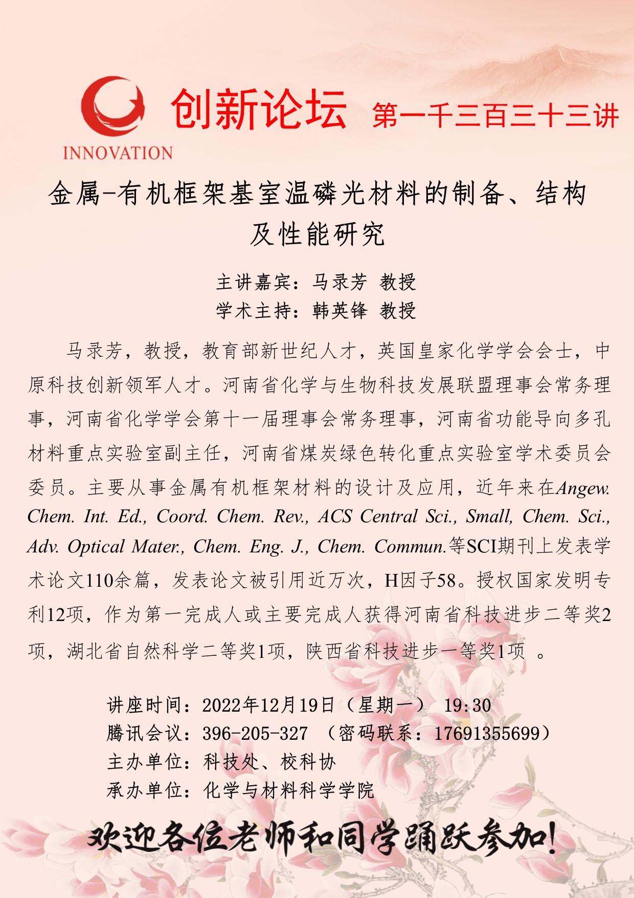 马录芳 教授 开云手机网页版登录入口创新论坛第一千三百三十三讲:金属-有机框架基室温磷光材料的制备、结构及性能研究 讲座时间 2022年12月19日(星期一) 19:30 讲座地点 腾讯会议:396-205-327 讲座人介绍 马录芳 教授 讲座内容