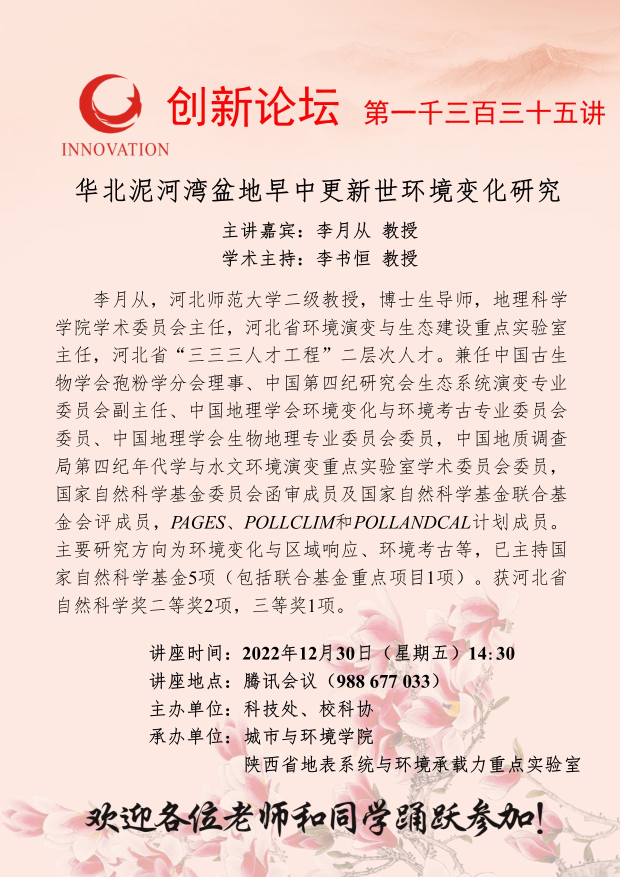 李月从 教授 开云手机网页版登录入口创新论坛第一千三百三十五讲:华北泥河湾盆地早中更新世环境变化研究 讲座时间 2022年12月30日(星期五)14:30 讲座地点 腾讯会议(988 677 033) 讲座人介绍 李月从 教授 讲座内容