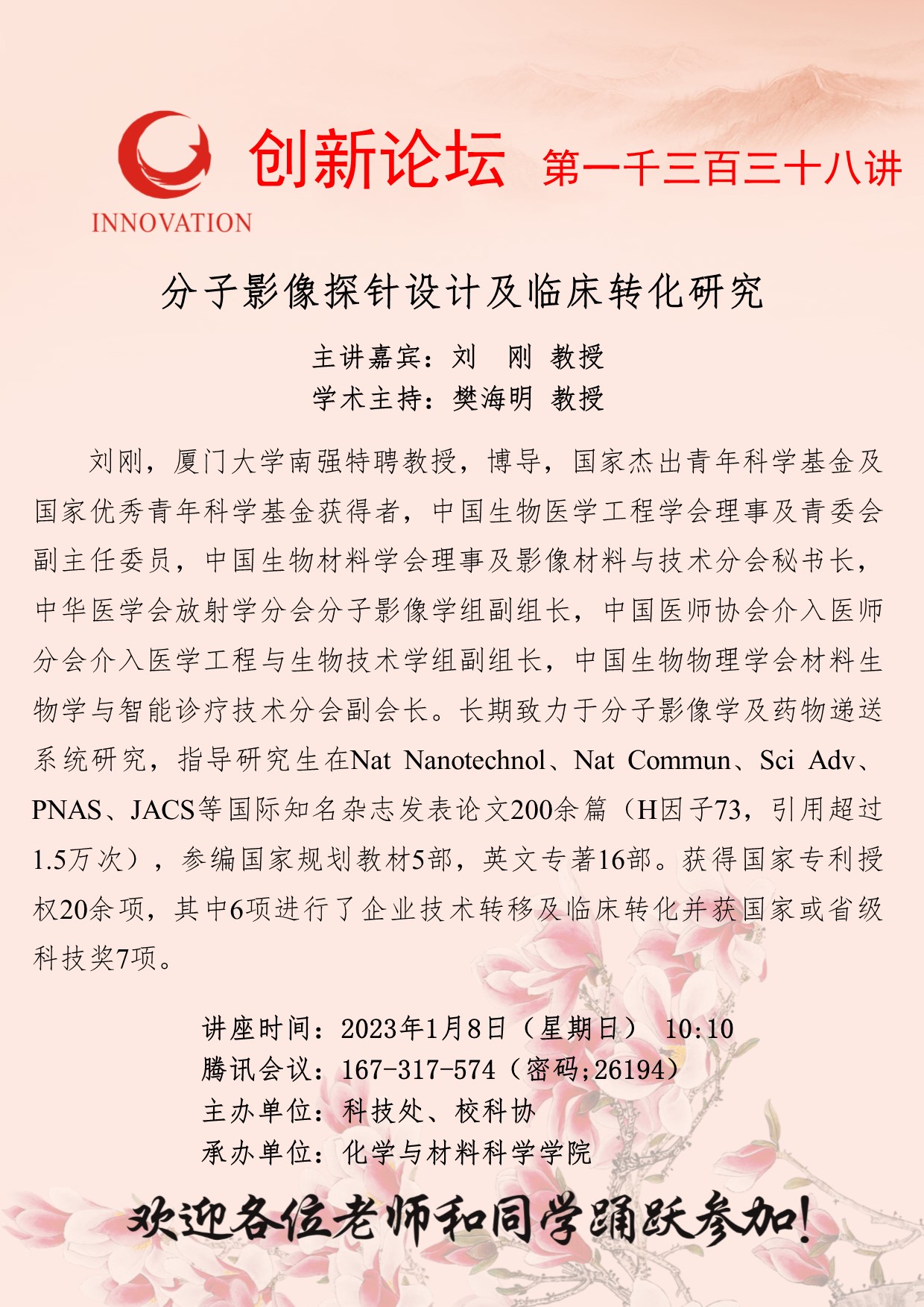 刘刚 教授 开云手机网页版登录入口创新论坛第一千三百三十八讲:分子影像探针设计及临床转化研究 讲座时间 2023年1月8日(星期日) 10:10 讲座地点 腾讯会议:167-317-574 讲座人介绍 刘刚 教授 讲座内容