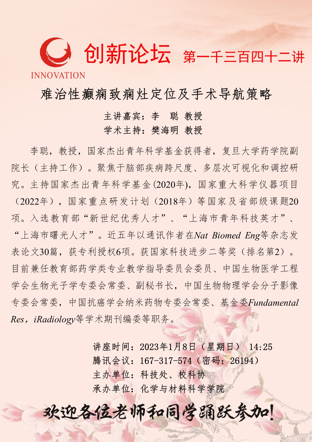 李聪 教授 开云手机网页版登录入口创新论坛第一千三百四十二讲:难治性癫痫致痫灶定位及手术导航策略 讲座时间 2023年1月8日(星期日) 14:25 讲座地点 腾讯会议:167-317-574 讲座人介绍 李聪 教授 讲座内容