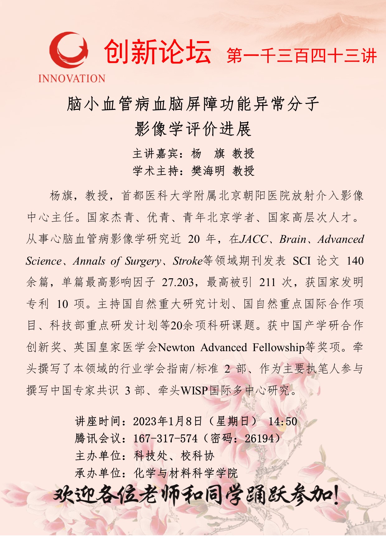 杨旗 教授 开云手机网页版登录入口创新论坛第一千三百四十三讲:脑小血管病血脑屏障功能异常分子影像学评价进展 讲座时间 2023年1月8日(星期日) 14:50 讲座地点 腾讯会议:167-317-574 讲座人介绍 杨旗 教授 讲座内容