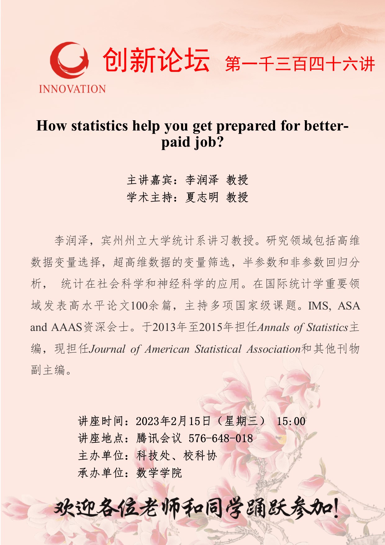 李润泽 教授 开云手机网页版登录入口创新论坛第一千三百四十六讲:How statistics help you get prepared for better-paid job? 讲座时间 2023年2月15日(星期三) 15:00 讲座地点 腾讯会议 576-648-018 讲座人介绍 李润泽 教授 讲座内容
