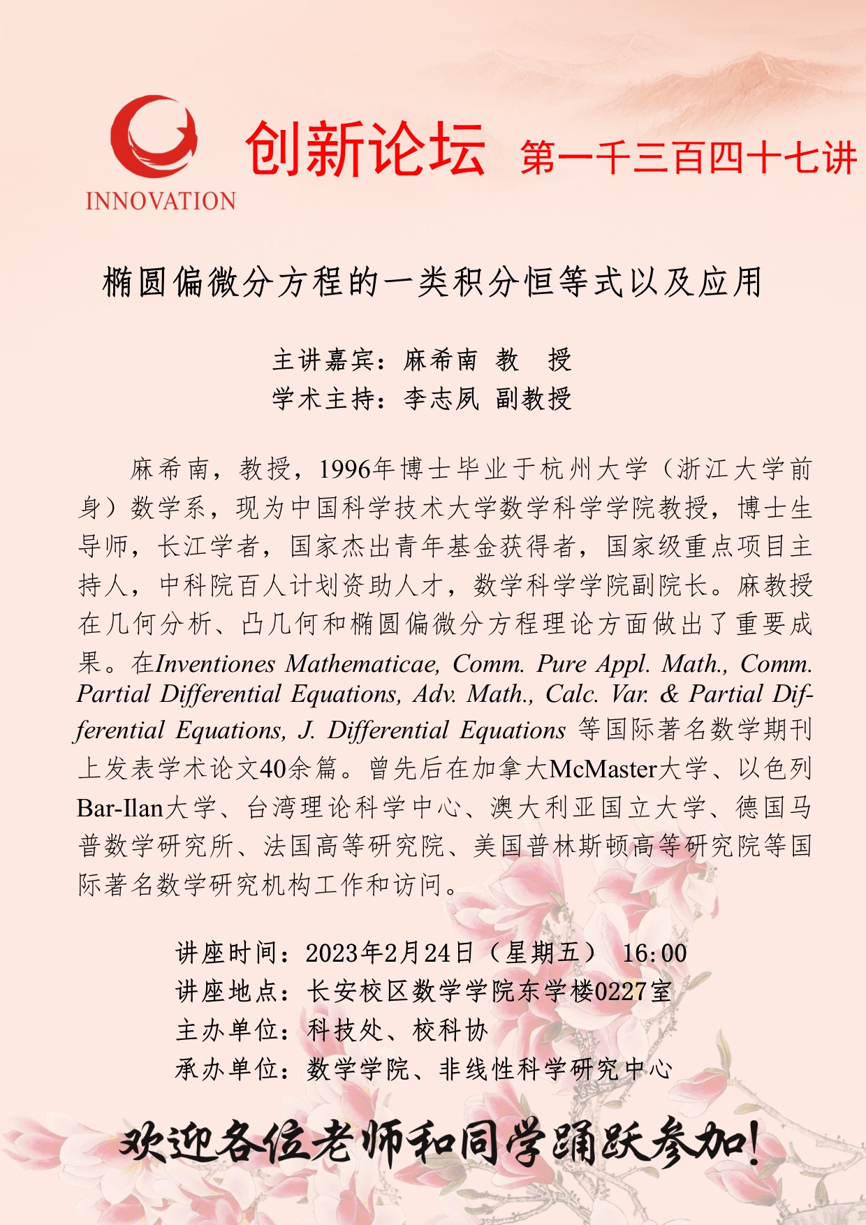 麻希南 教授 开云手机网页版登录入口创新论坛第一千三百四十七讲: 椭圆偏微分方程的一类积分恒等式以及应用 讲座时间 2023年2月24日(星期五)16:00 讲座地点 长安校区数学学院东学楼0227室 讲座人介绍 麻希南 教授 讲座内容