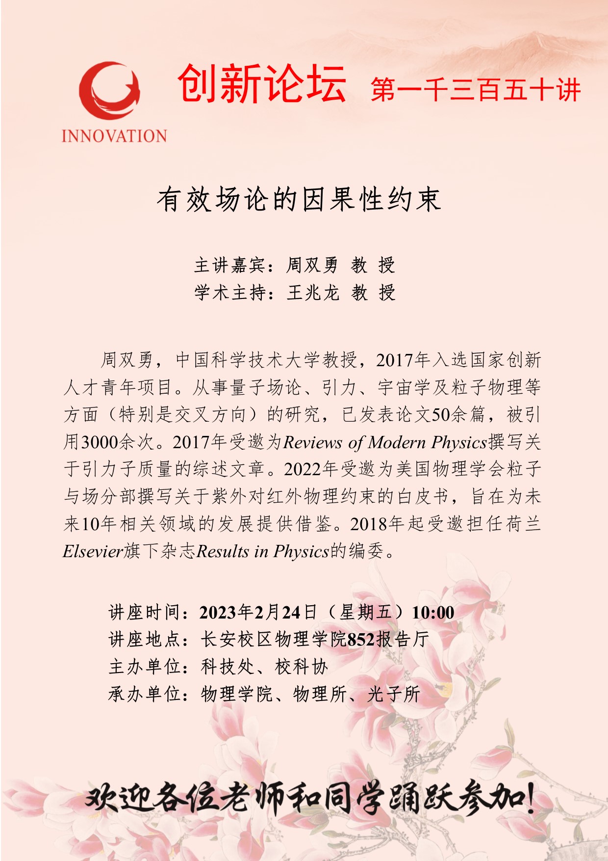 周双勇 教授 开云手机网页版登录入口创新论坛第一千三百五十讲: 有效场论的因果性约束 讲座时间 2023年2月24日(星期五)10:00 讲座地点 长安校区物理学院852报告厅 讲座人介绍 周双勇 教授 讲座内容