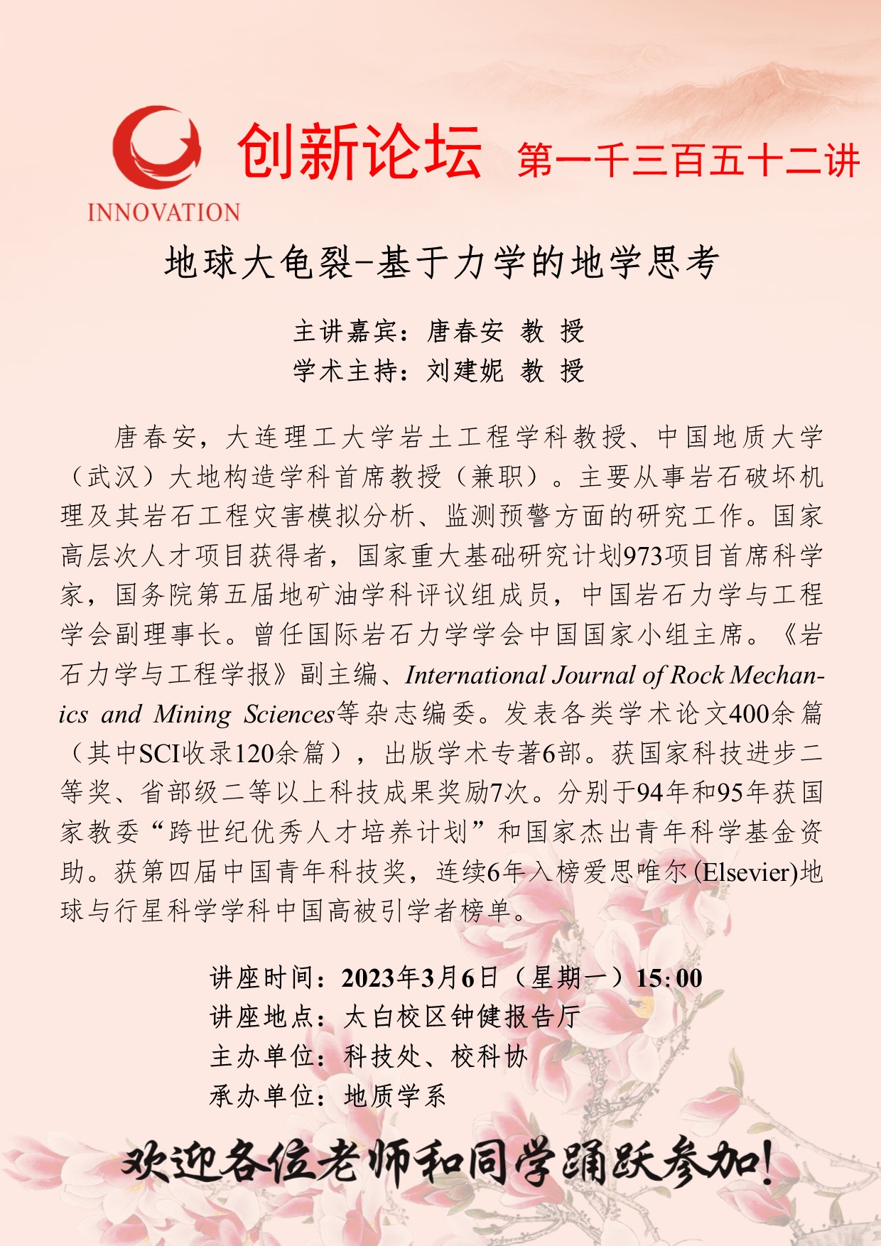 唐春安 教授 开云手机网页版登录入口创新论坛第一千三百五十二讲:地球大龟裂-基于力学的地学思考 讲座时间 2023年3月6日(星期一)15:00 讲座地点 太白校区钟健报告厅 讲座人介绍 唐春安 教授 讲座内容