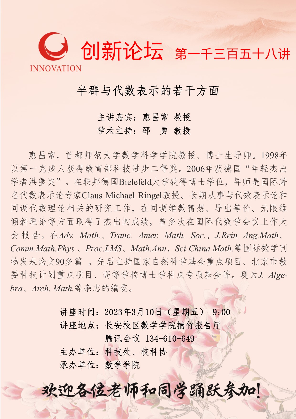 惠昌常 教授 开云手机网页版登录入口创新论坛第一千三百五十八讲:半群与代数表示的若干方面 讲座时间 2023年3月10日(星期五) 9:00 讲座地点 长安校区数学学院楠竹报告厅、腾讯会议134-610-649 讲座人介绍 惠昌常 教授 讲座内容