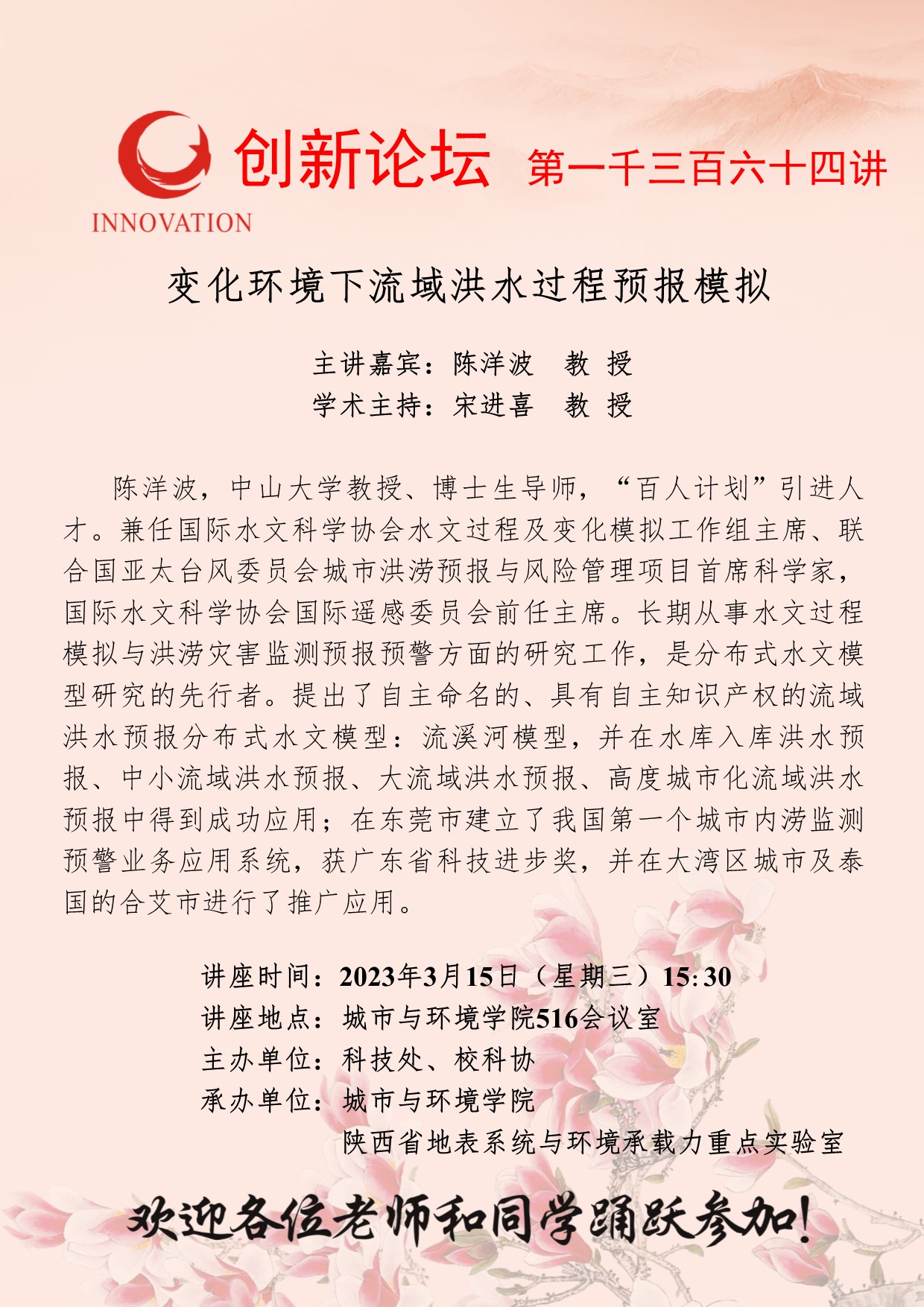 陈洋波 教授 开云手机网页版登录入口创新论坛第一千三百六十四讲:变化环境下流域洪水过程预报模拟 讲座时间 2023年3月15日(星期三)15:30 讲座地点 城市与环境学院516会议室 讲座人介绍 陈洋波 教授 讲座内容