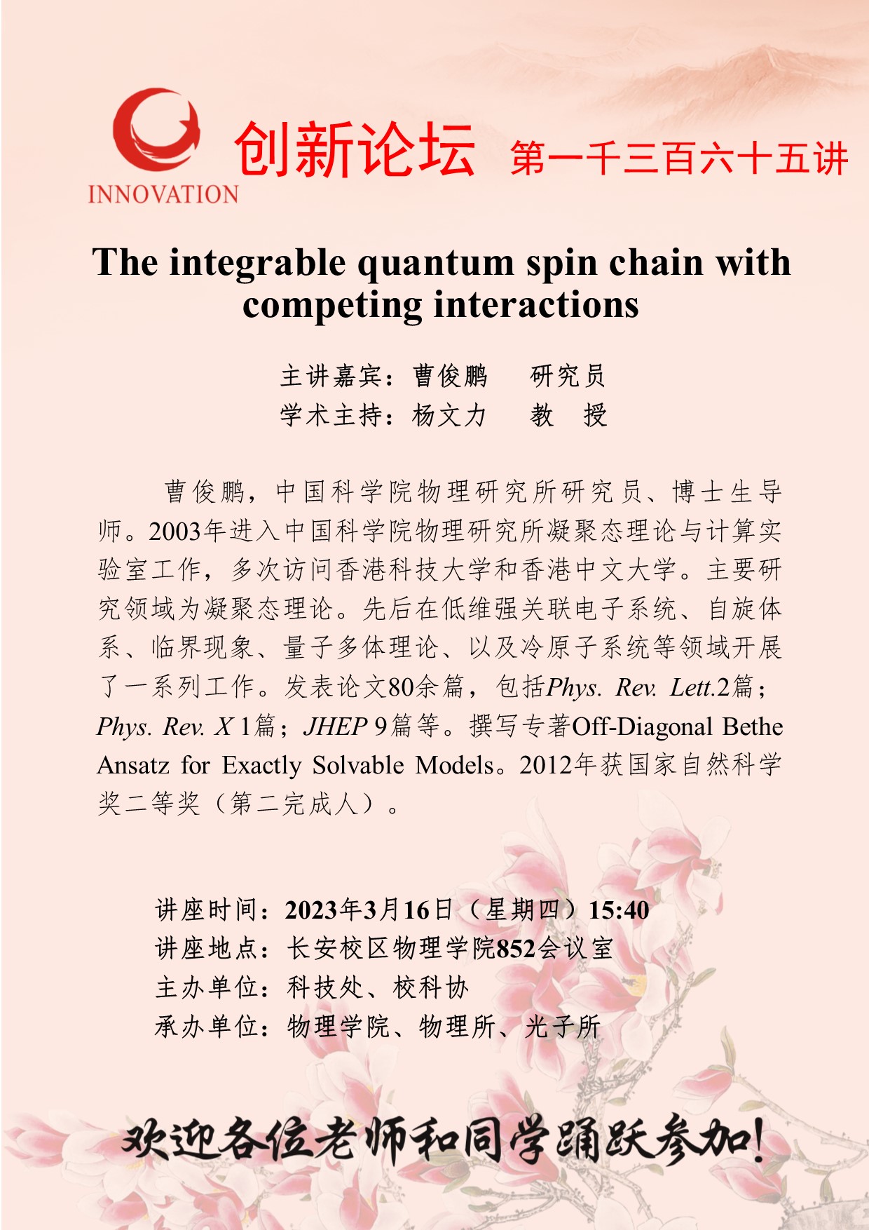 曹俊鹏 研究员 开云手机网页版登录入口创新论坛第一千三百六十五讲:The integrable quantum spin chain with competing interactions 讲座时间 2023年3月16日(星期四)15:40 讲座地点 长安校区物理学院852会议室 讲座人介绍 曹俊鹏 研究员 讲座内容