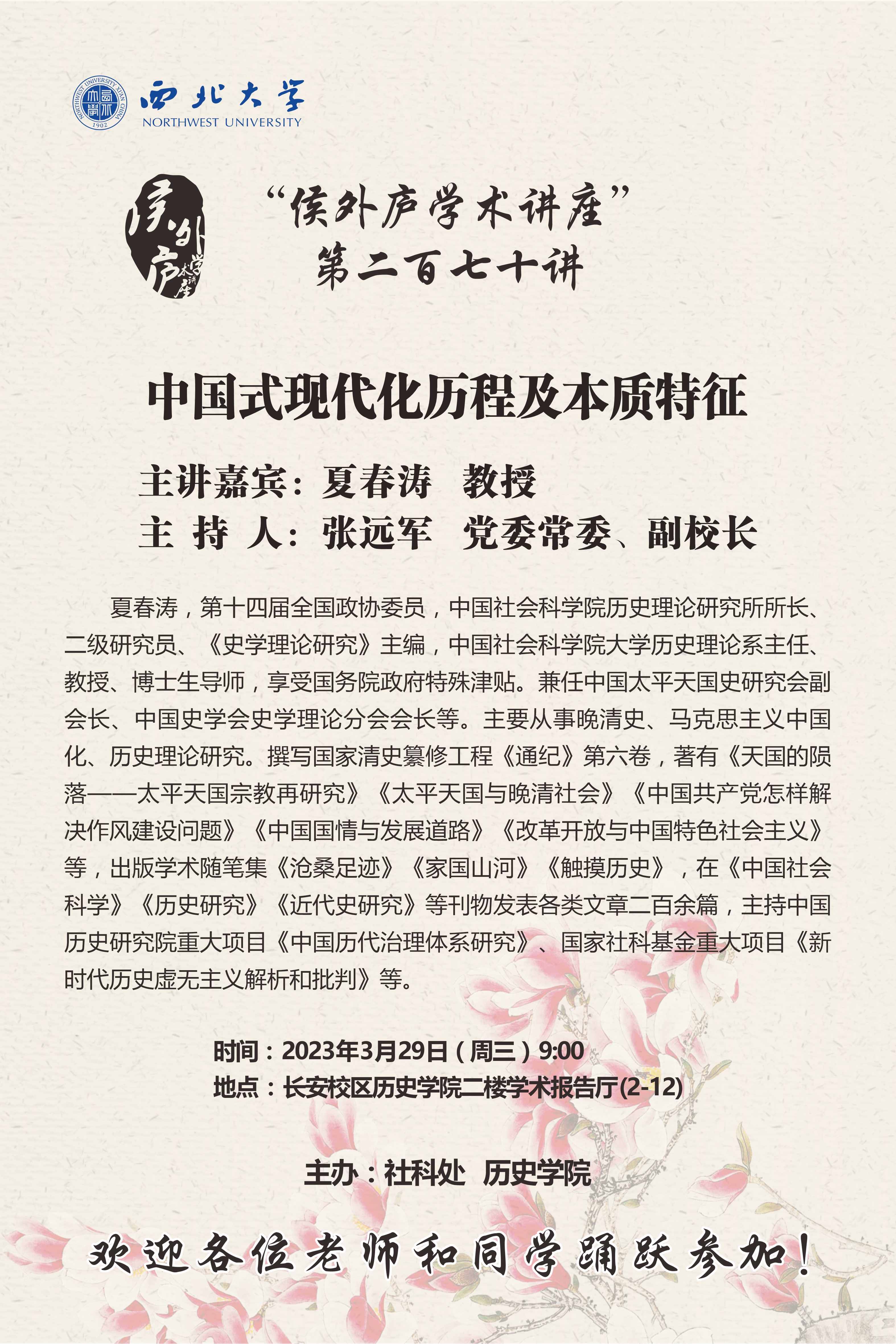 夏春涛 教授 侯外庐学术讲座第二百七十讲:中国式现代化历程及本质特征 讲座时间 2023年3月29日(周三)9:00 讲座地点 长安校区历史学院二楼学术报告厅(2-12) 讲座人介绍 夏春涛 教授 讲座内容