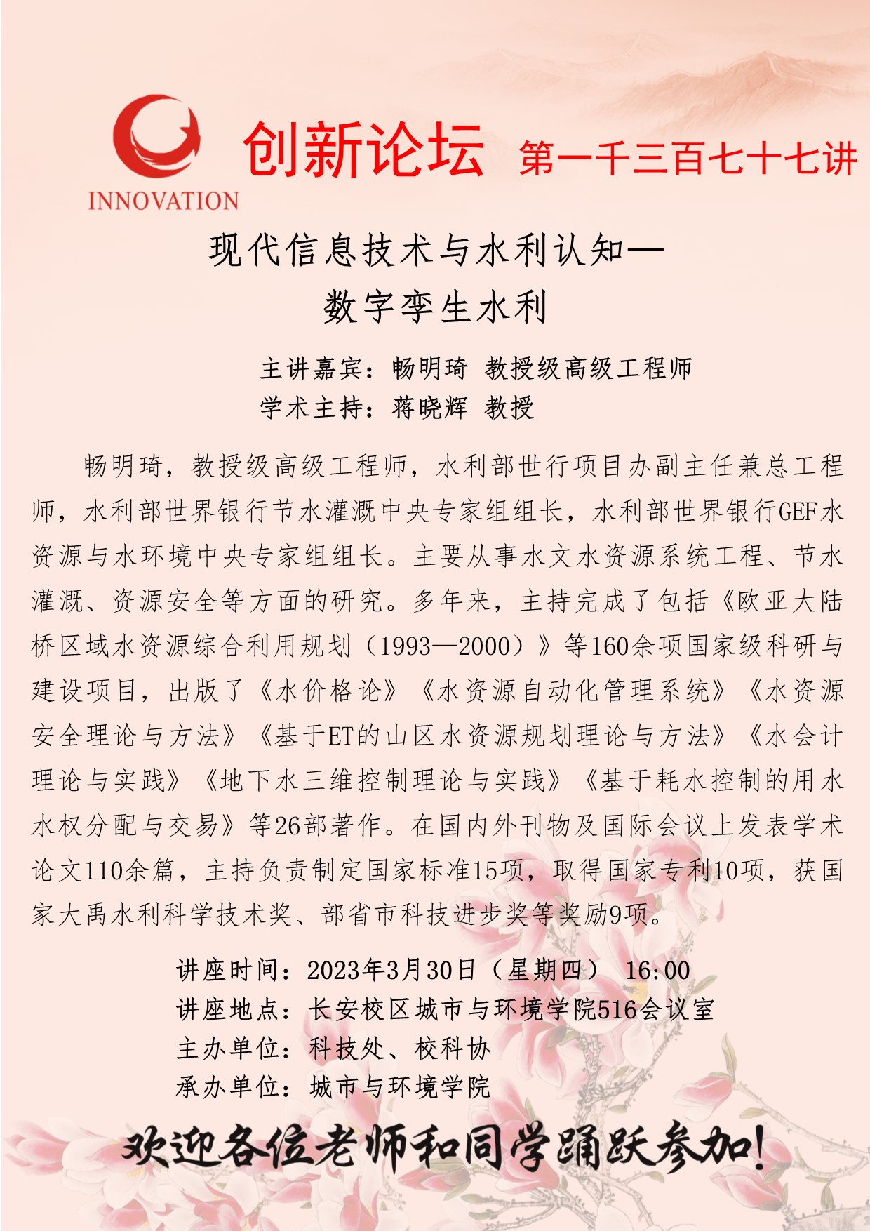 畅明琦 教授级高级工程师 开云手机网页版登录入口创新论坛第一千三百七十七讲:现代信息技术与水利认知—数字孪生水利 讲座时间 2023年3月30日(星期四) 16:00 讲座地点 长安校区城市与环境学院516会议室 讲座人介绍 畅明琦 教授级高级工程师 讲座内容
