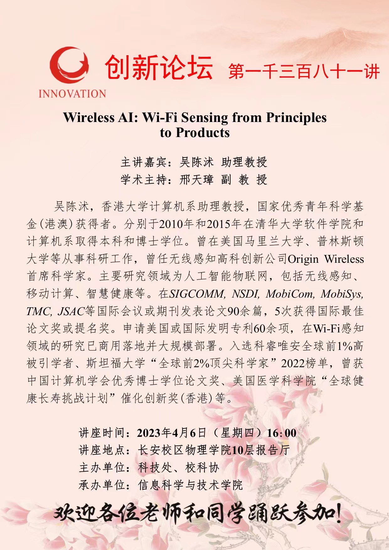 吴陈沭 助理教授 开云手机网页版登录入口创新论坛第一千三百八十一讲:Wireless AI: Wi-Fi Sensing from Principles to Products 讲座时间 2023年4月6日(星期四)16:00 讲座地点 长安校区物理学院10层报告厅 讲座人介绍 吴陈沭 助理教授 讲座内容