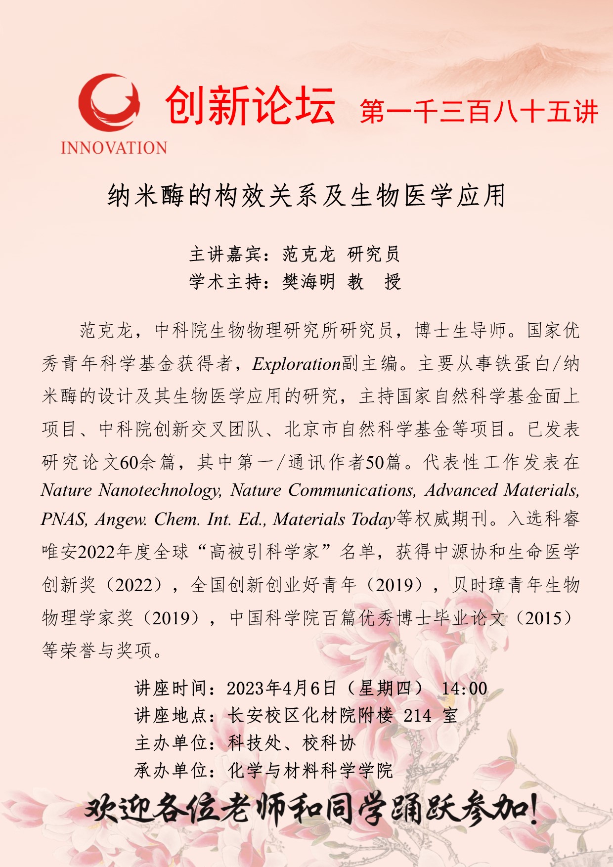 范克龙 研究员 开云手机网页版登录入口创新论坛第一千三百八十五讲:纳米酶的构效关系及生物医学应用 讲座时间 2023年4月6日(星期四) 14:00 讲座地点 长安校区化材院附楼 214 室 讲座人介绍 范克龙 研究员 讲座内容