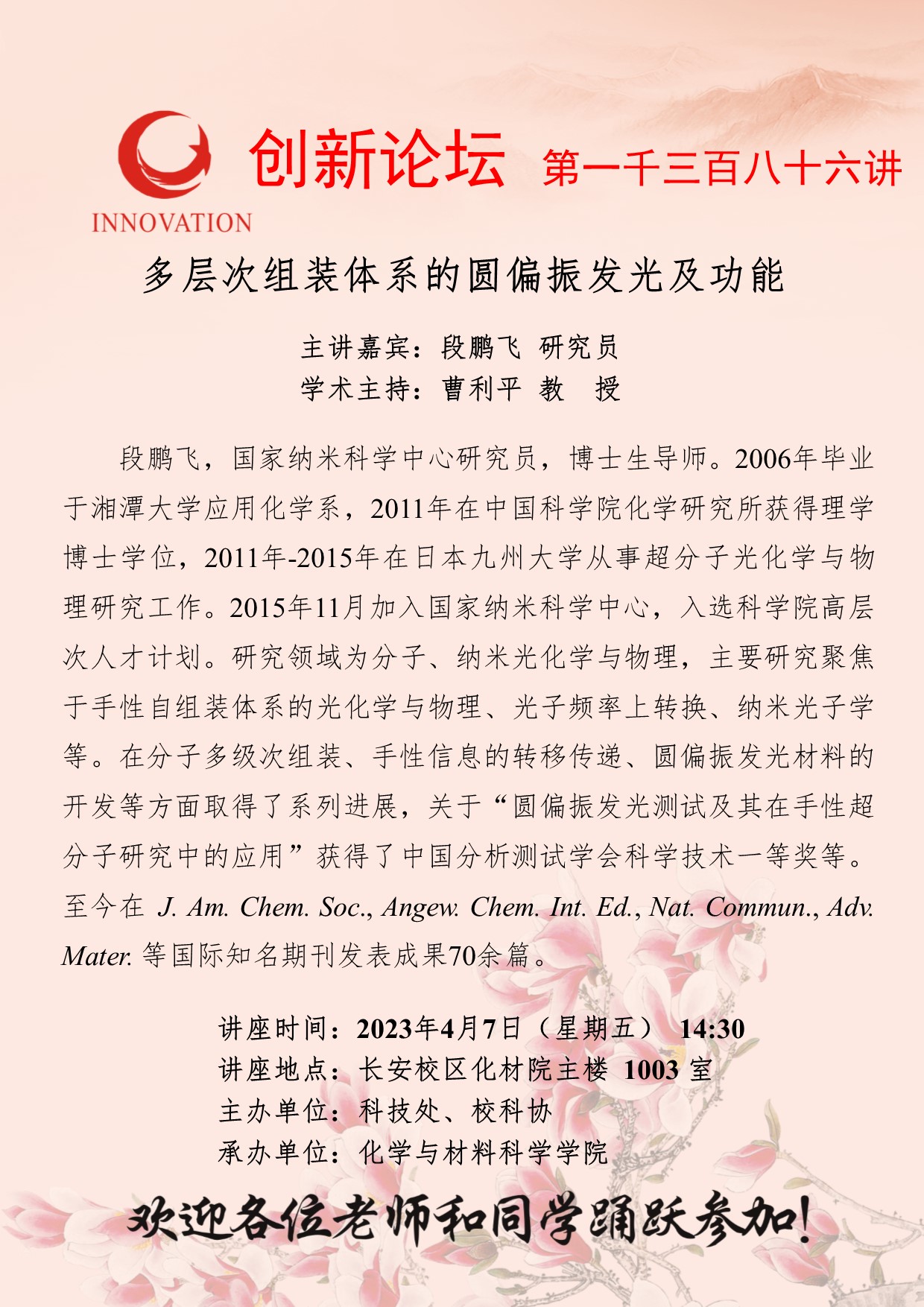 段鹏飞 研究员 开云手机网页版登录入口创新论坛第一千三百八十六讲:多层次组装体系的圆偏振发光及功能应用 讲座时间 2023年4月7日(星期五) 14:30 讲座地点 长安校区化材院主楼 1003 室 讲座人介绍 段鹏飞 研究员 讲座内容