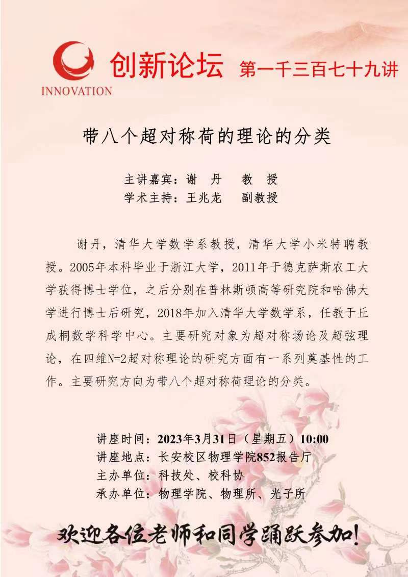 谢丹 教授 开云手机网页版登录入口创新论坛第一千三百七十九讲:带八个超对称荷的理论的分类 讲座时间 2023年3月31日(星期五)10:00 讲座地点 长安校区物理学院852报告厅 讲座人介绍 谢丹 教授 讲座内容