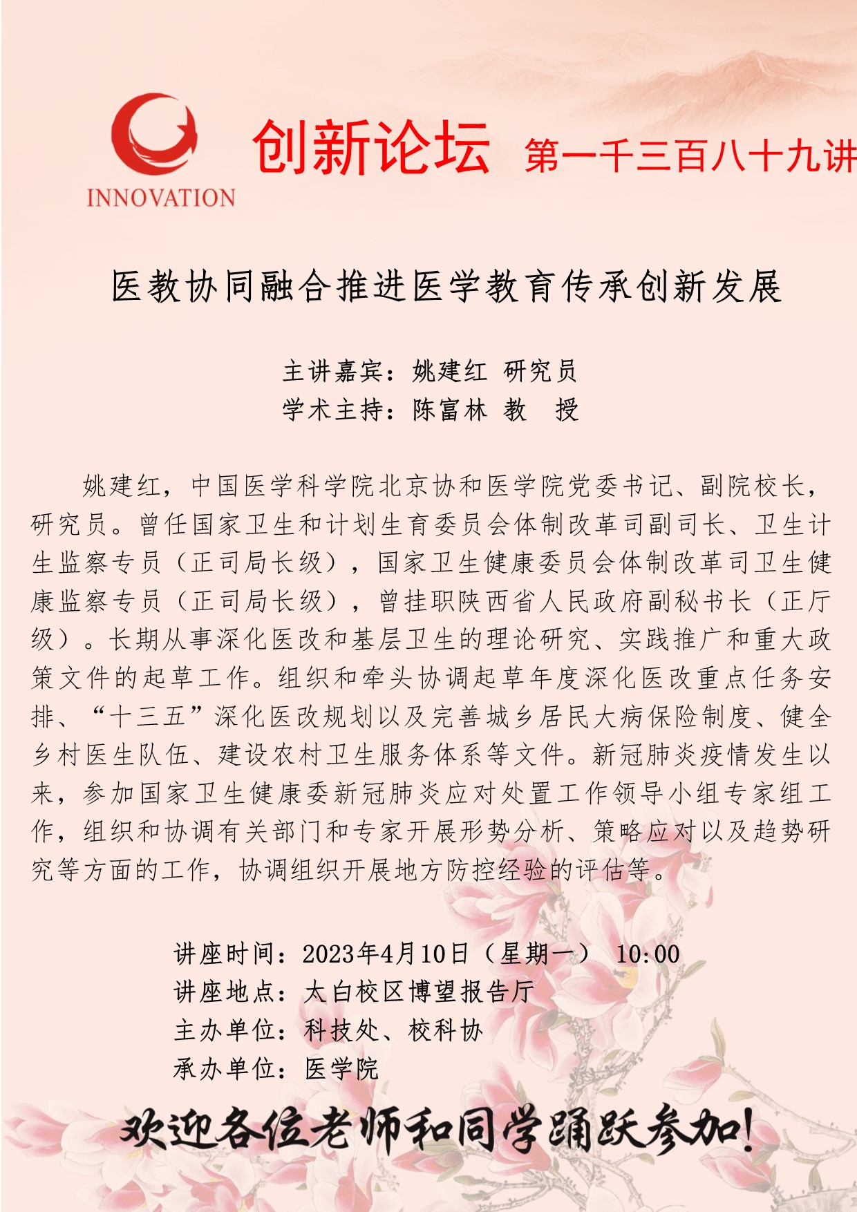 姚建红 研究员 开云手机网页版登录入口创新论坛第一千三百八十九讲:医教协同融合推进医学教育传承创新发展 讲座时间 2023年4月10日(星期一) 10:00 讲座地点 太白校区博望报告厅 讲座人介绍 姚建红 研究员 讲座内容