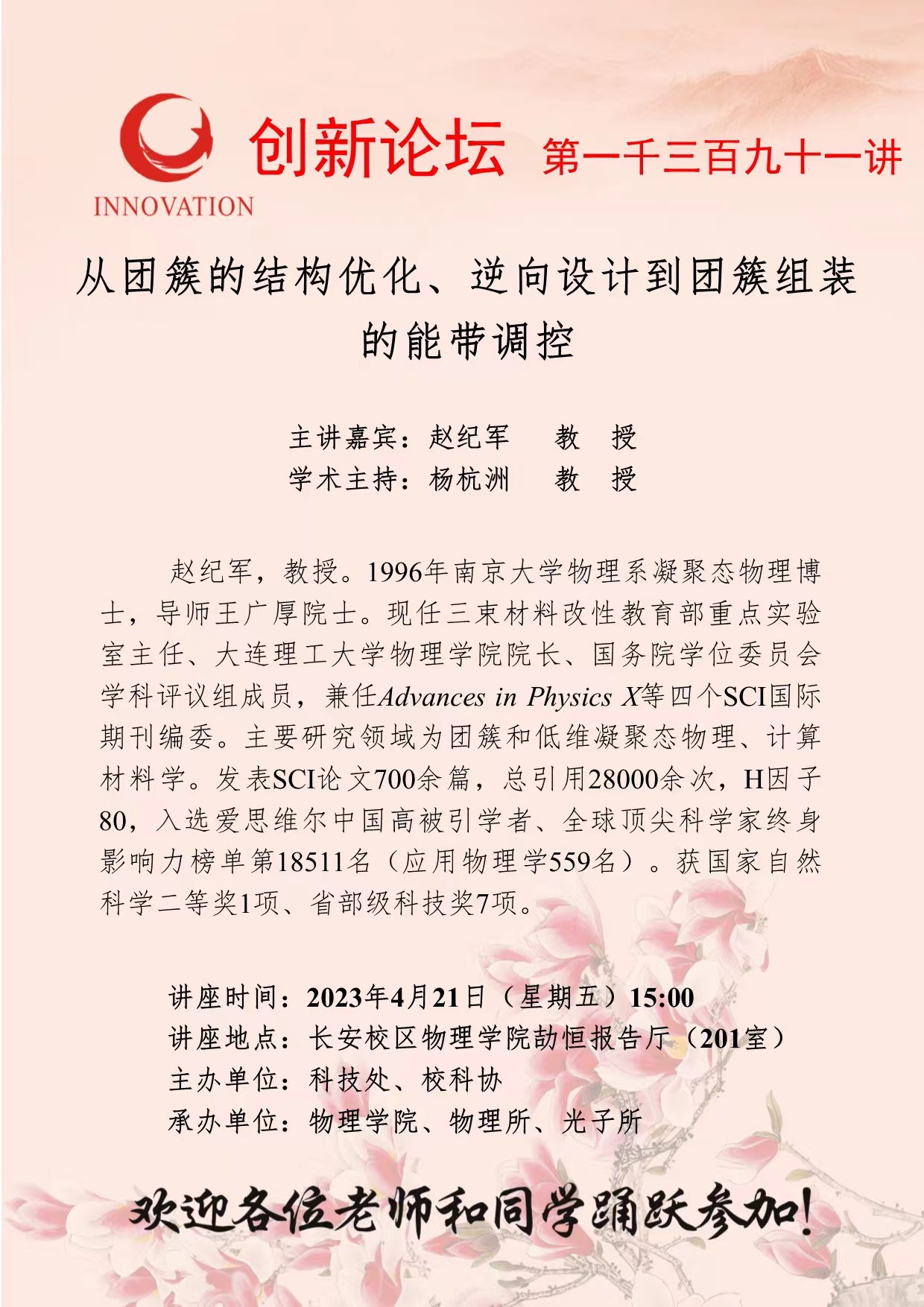 赵纪军 教 授 开云手机网页版登录入口创新论坛第一千三百九十一讲:从团簇的结构优化、逆向设计到团簇组装的能带调控 讲座时间 2023年4月21日(星期五)15:00 讲座地点 长安校区物理学院劼恒报告厅(201室) 讲座人介绍 赵纪军 教 授 讲座内容