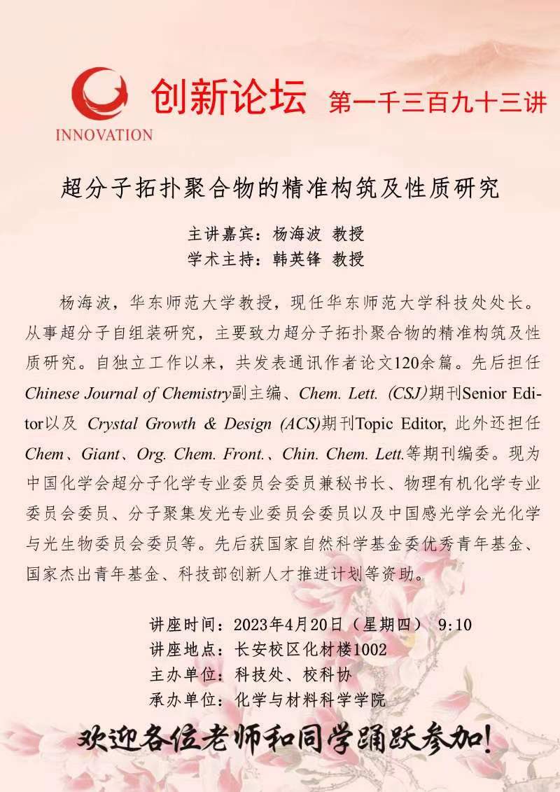 杨海波 教授 开云手机网页版登录入口创新论坛第一千三百九十三讲:超分子拓扑聚合物的精准构筑及性质研究 讲座时间 2023年4月20日(星期四) 9:10 讲座地点 长安校区化材楼1002 讲座人介绍 杨海波 教授 讲座内容