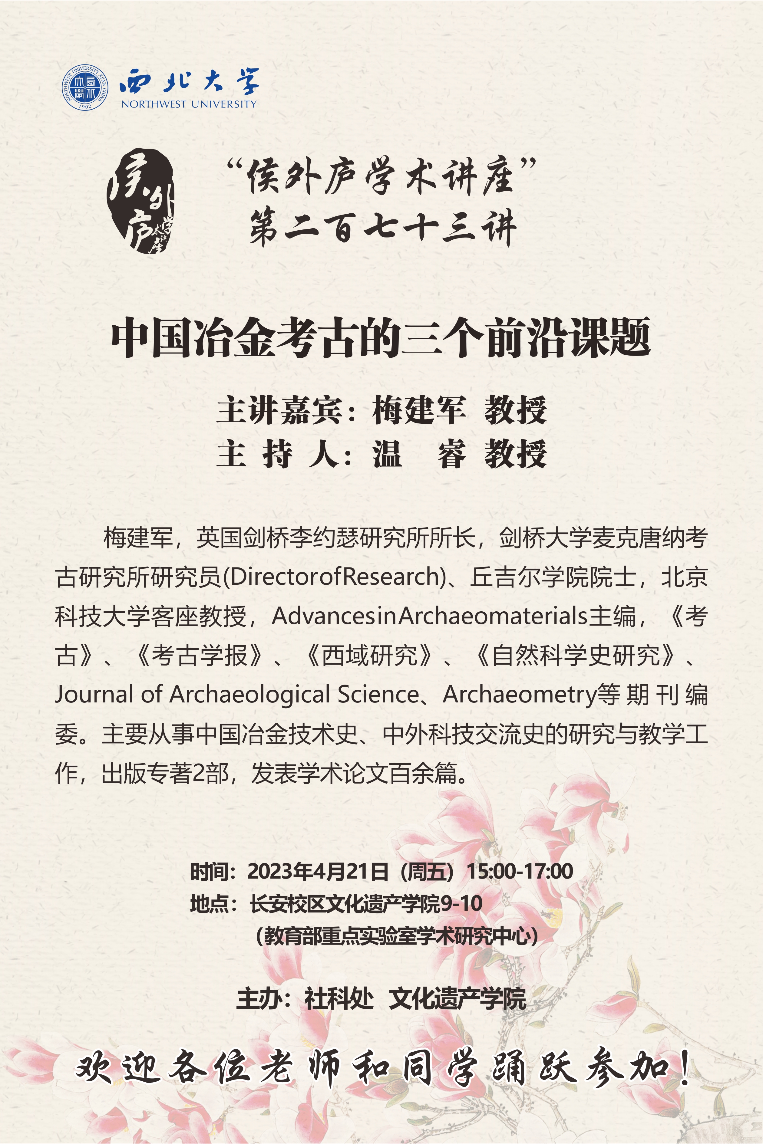 梅建军 教授 侯外庐学术讲座第二百七十三讲:中国冶金考古的三个前沿课题 讲座时间 2023年4月21日(周五)15:00 讲座地点 文化遗产学院9-10(教育部重点实验室学术研究中心) 讲座人介绍 梅建军 教授 讲座内容