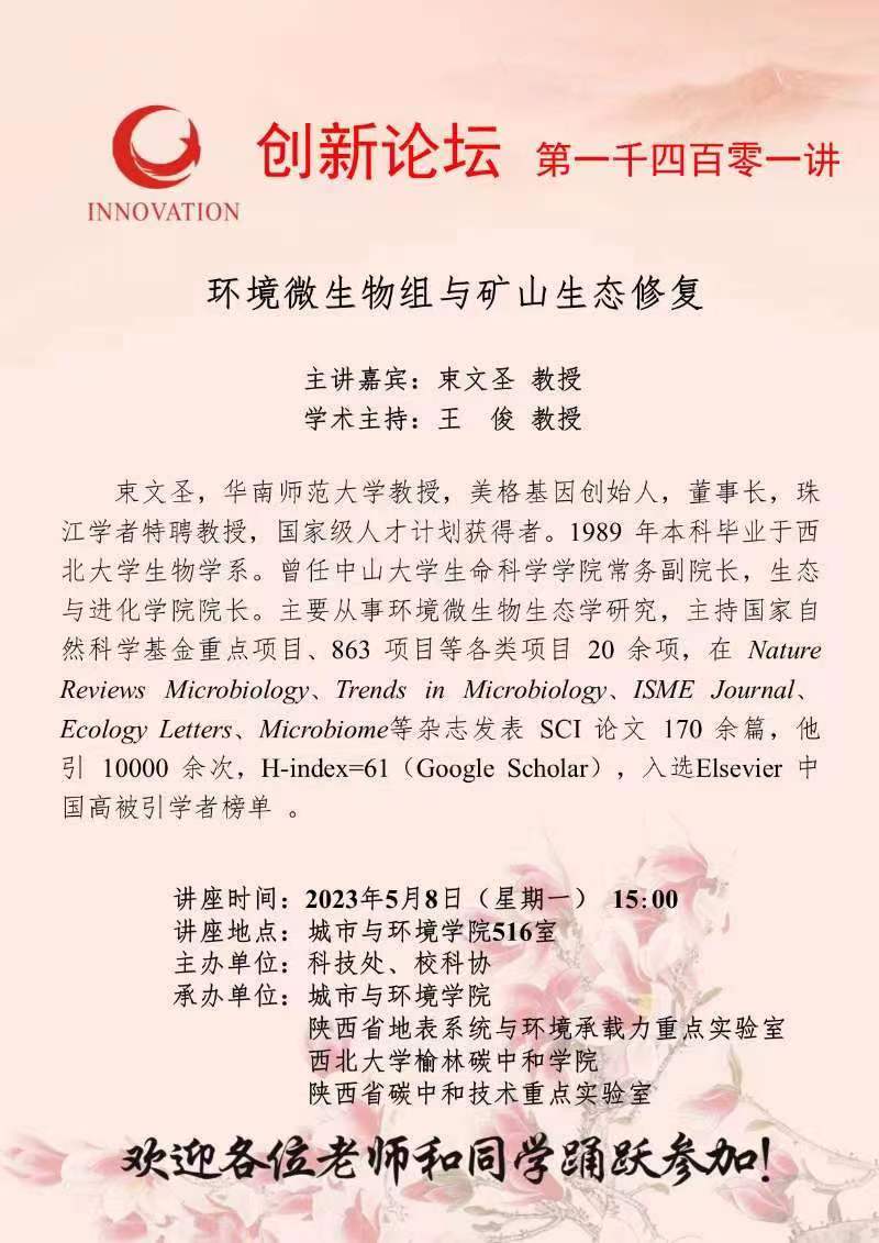 束文圣 教授 开云手机网页版登录入口创新论坛第一千四百零一讲:环境微生物组与矿山生态修复 讲座时间 2023年5月8日(星期一) 15:00 讲座地点 城市与环境学院516室 讲座人介绍 束文圣 教授 讲座内容