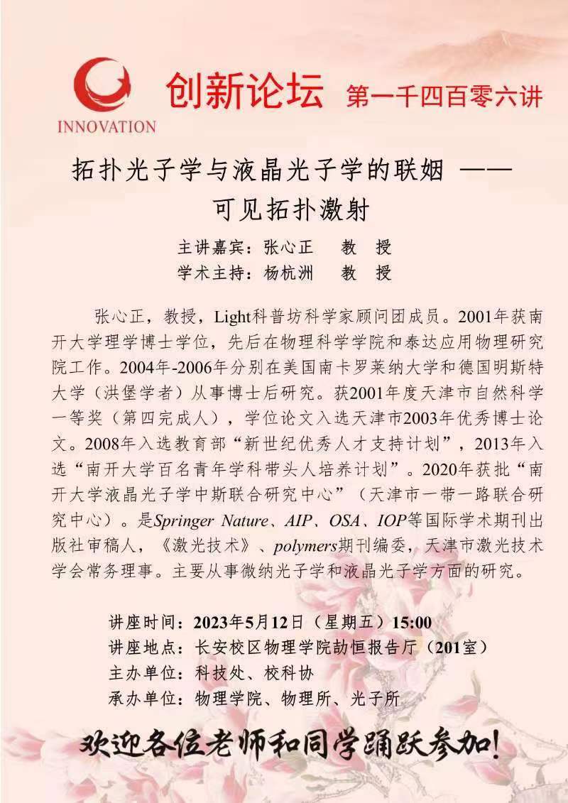张心正 教 授 开云手机网页版登录入口创新论坛第一千四百零六讲:拓扑光子学与液晶光子学的联姻 — 可见拓扑激射 讲座时间 2023年5月12日(星期五)15:00 讲座地点 长安校区物理学院劼恒报告厅(201室) 讲座人介绍 张心正 教 授 讲座内容