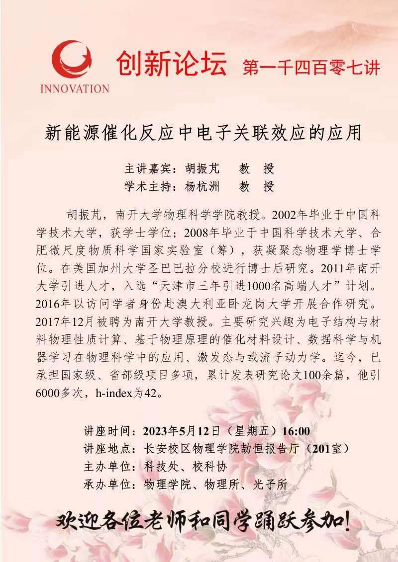 胡振芃 教 授 开云手机网页版登录入口创新论坛第一千四百零七讲:新能源催化反应中电子关联效应的应用 讲座时间 2023年5月12日(星期五)16:00 讲座地点 长安校区物理学院劼恒报告厅(201室) 讲座人介绍 胡振芃 教 授 讲座内容