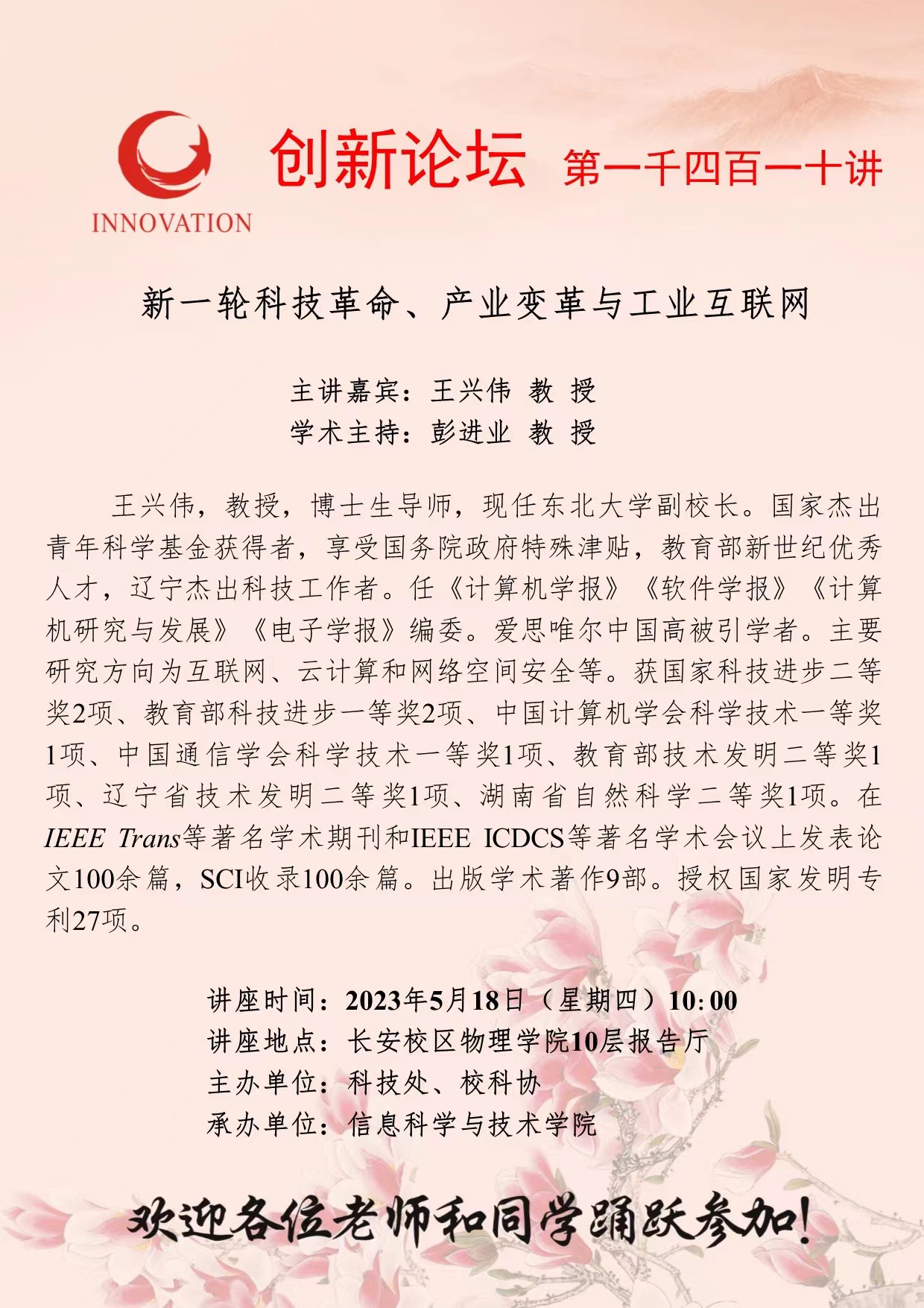 王兴伟 教 授 开云手机网页版登录入口创新论坛第一千四百零一十讲:新一轮科技革命、产业变革与工业互联网 讲座时间 2023年5月18日(星期四)10:00 讲座地点 长安校区物理学院10层报告厅 讲座人介绍 王兴伟 教 授 讲座内容