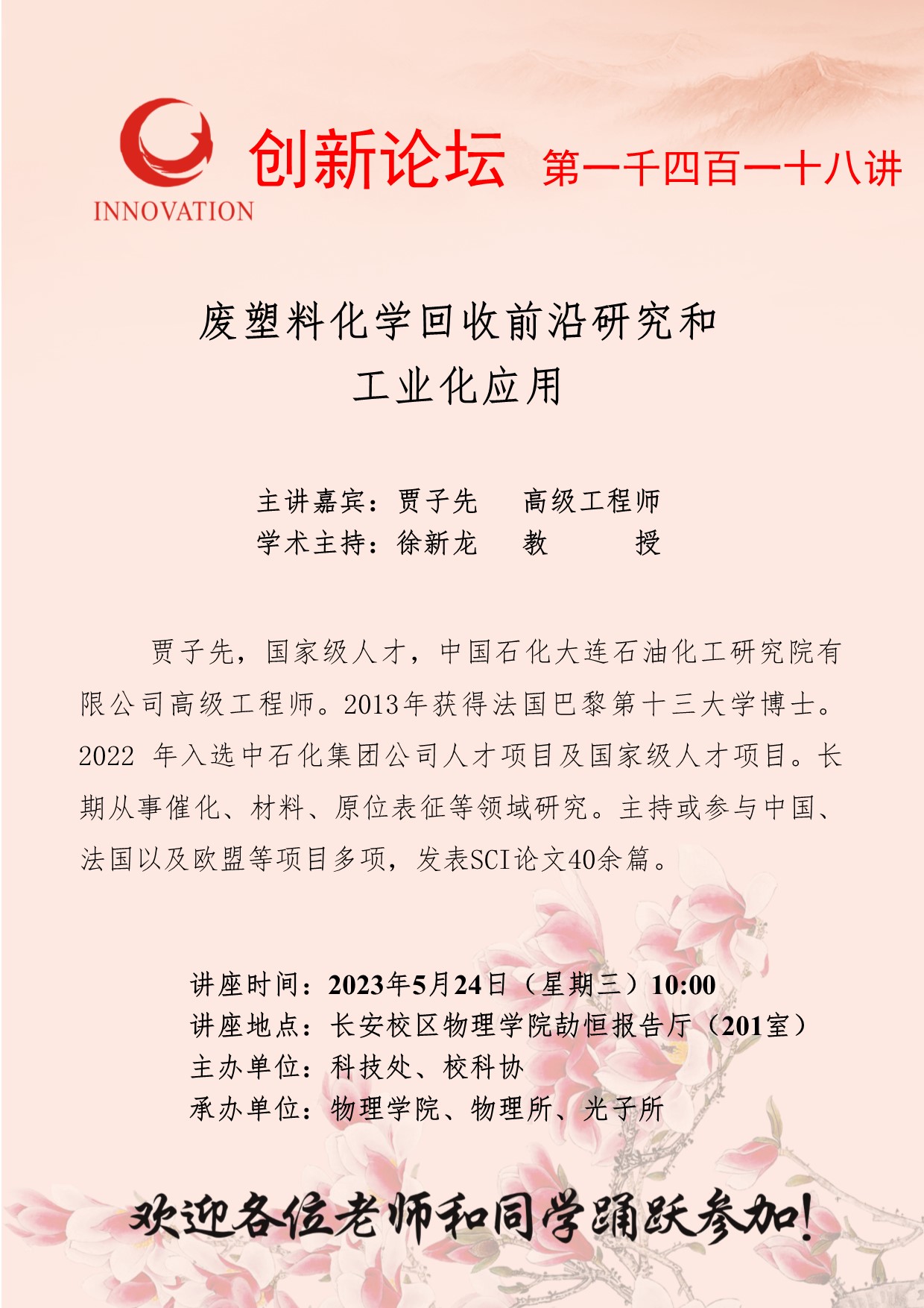 贾子先 高级工程师 开云手机网页版登录入口创新论坛第一千四百一十八讲:废塑料化学回收前沿研究和工业化应用 讲座时间 2023年5月24日(星期三)10:00 讲座地点 长安校区物理学院劼恒报告厅(201室) 讲座人介绍 贾子先 高级工程师 讲座内容