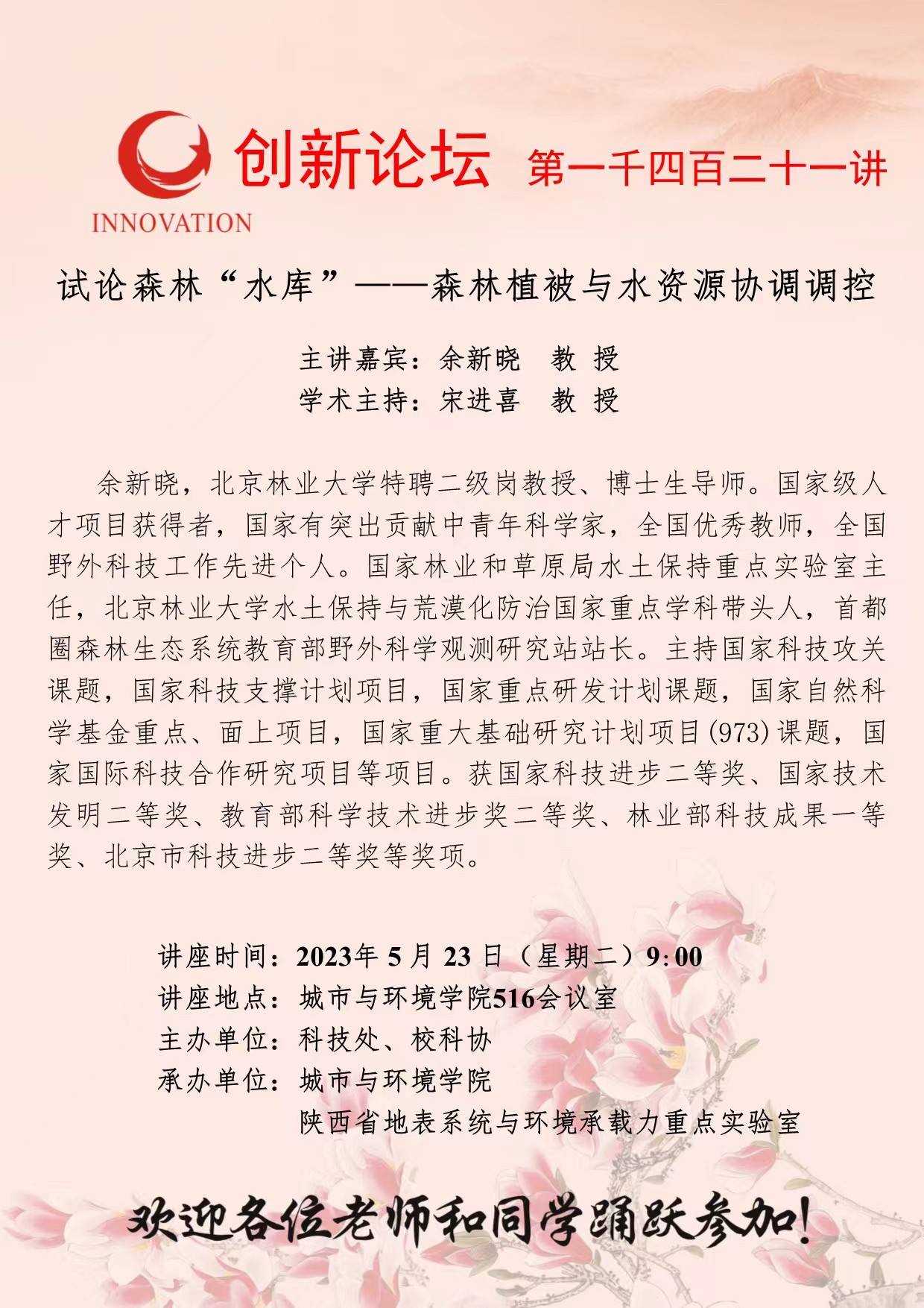 余新晓 教 授 开云手机网页版登录入口创新论坛第一千四百二十一讲:试论森林“水库”——森林植被与水资源协调调控 讲座时间 2023年5月23日(星期二)9:00 讲座地点 城市与环境学院516会议室 讲座人介绍 余新晓 教 授 讲座内容