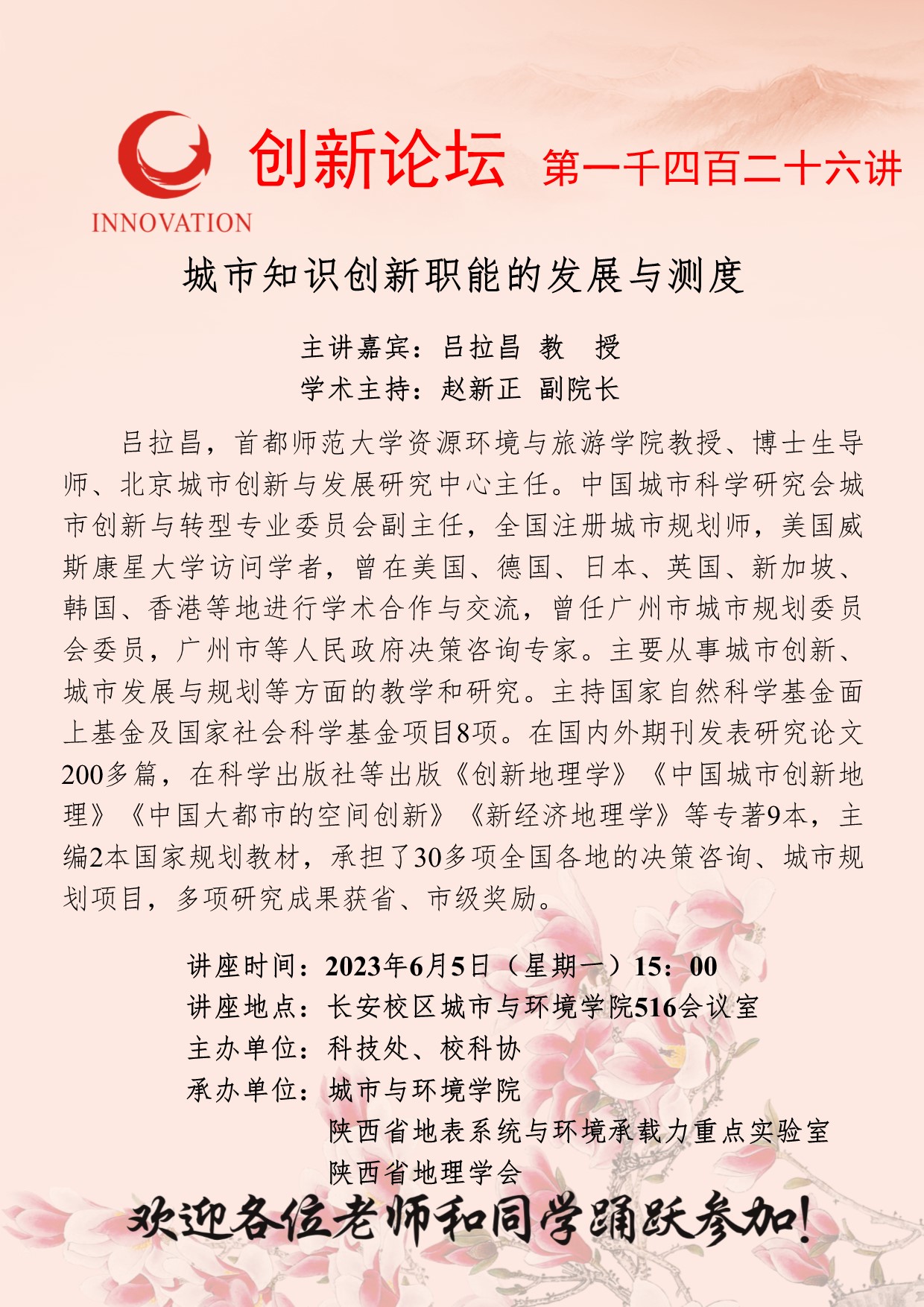 吕拉昌 教授 开云手机网页版登录入口创新论坛第一千四百二十六讲:城市知识创新职能的发展与测度 讲座时间 2023年6月5日(星期一)15:00 讲座地点 长安校区城市与环境学院516会议室 讲座人介绍 吕拉昌 教授 讲座内容