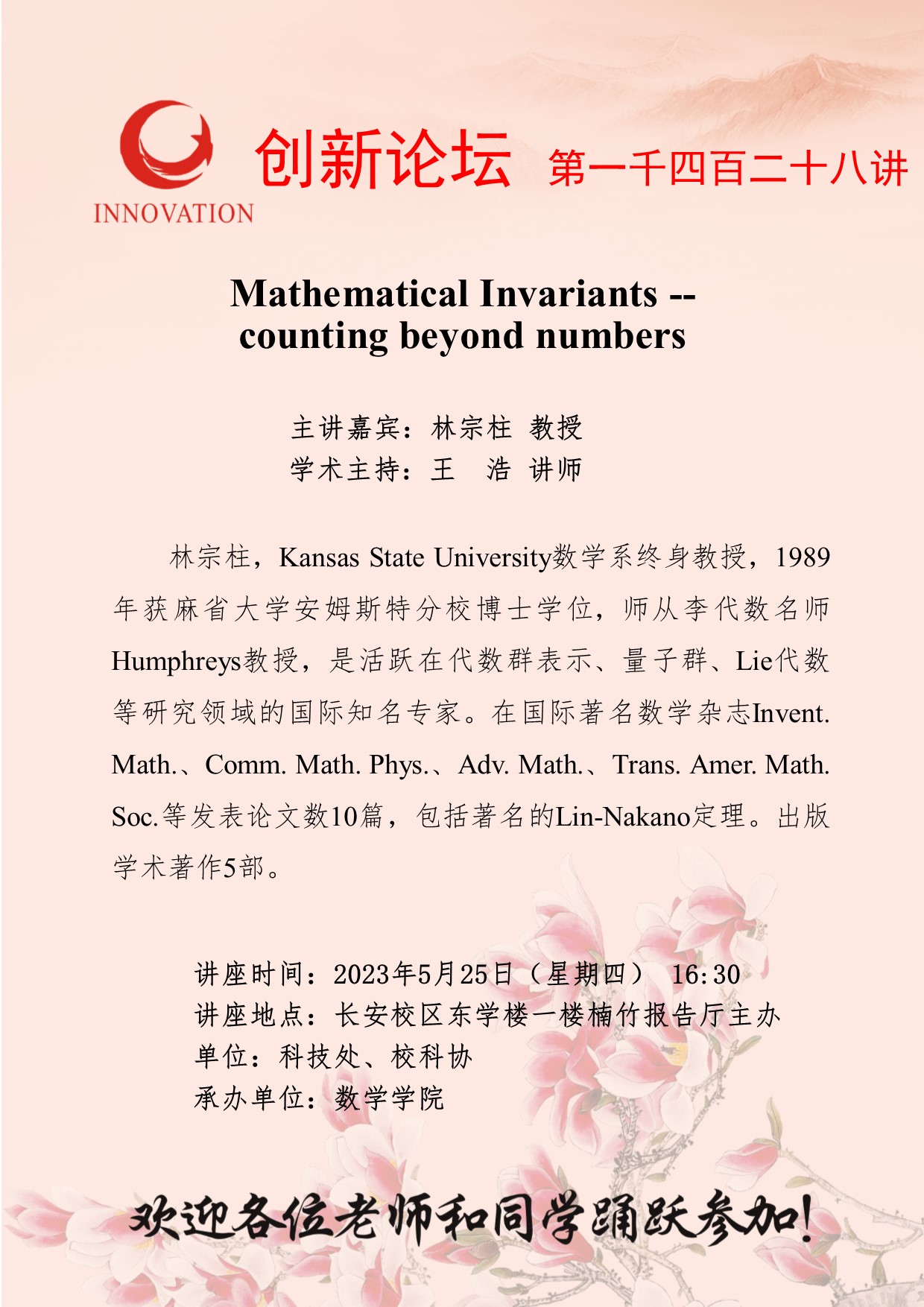 林宗柱 教授 开云手机网页版登录入口创新论坛第一千四百二十八讲:Mathematical Invariants --counting beyond numbers 讲座时间 2023年5月25日(星期四)16:30 讲座地点 长安校区东学楼一楼楠竹报告厅 讲座人介绍 林宗柱 教授 讲座内容