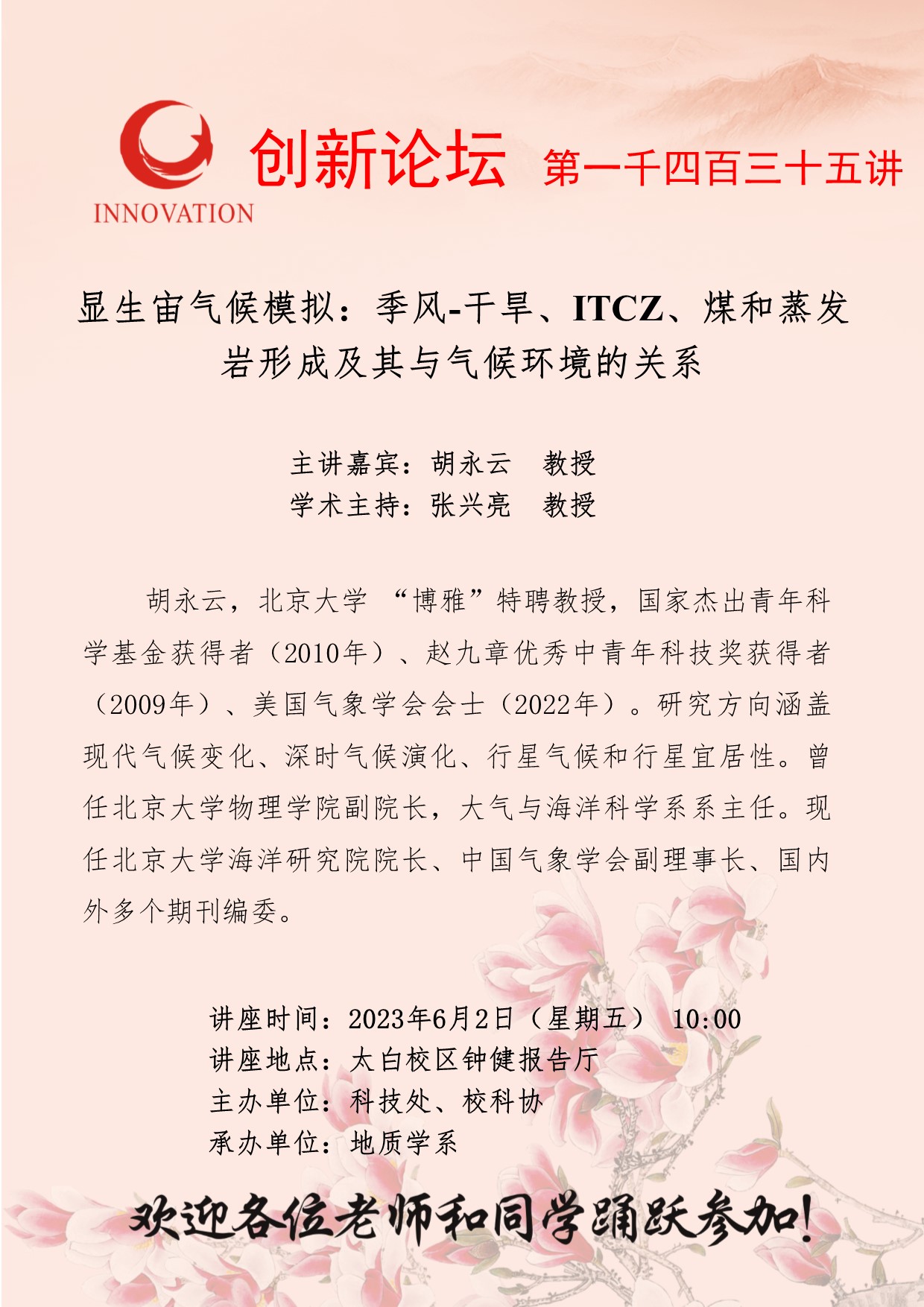 胡永云 教授 开云手机网页版登录入口创新论坛第一千四百三十五讲:显生宙气候模拟:季风-干旱、ITCZ、煤和蒸发岩形成及其与气候环境的关系 讲座时间 2023年6月2日(星期五) 10:00 讲座地点 太白校区钟健报告厅 讲座人介绍 胡永云 教授 讲座内容