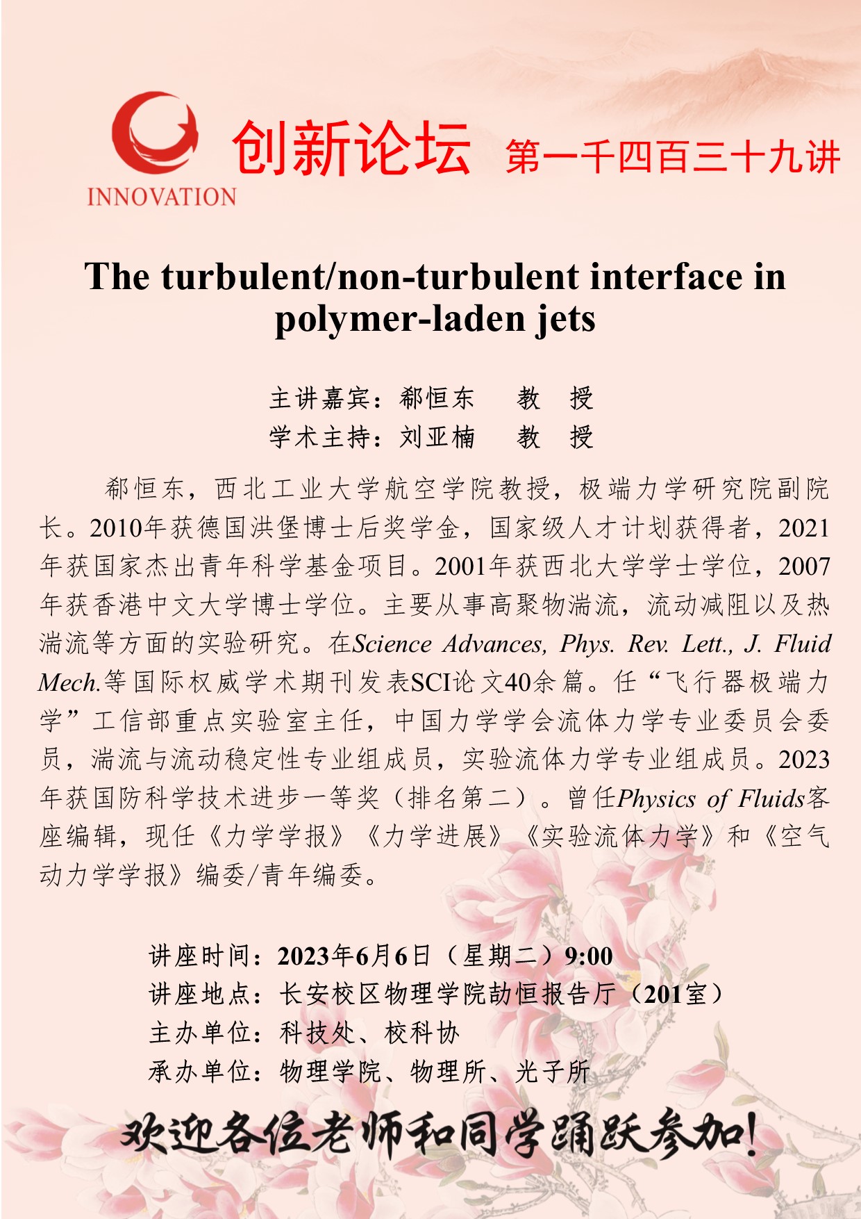 郗恒东 教授 开云手机网页版登录入口创新论坛第一千四百三十九讲:The turbulent/non-turbulent interface in polymer-laden jets 讲座时间 2023年6月6日(星期二)9:00 讲座地点 长安校区物理学院劼恒报告厅(201室) 讲座人介绍 郗恒东 教授 讲座内容