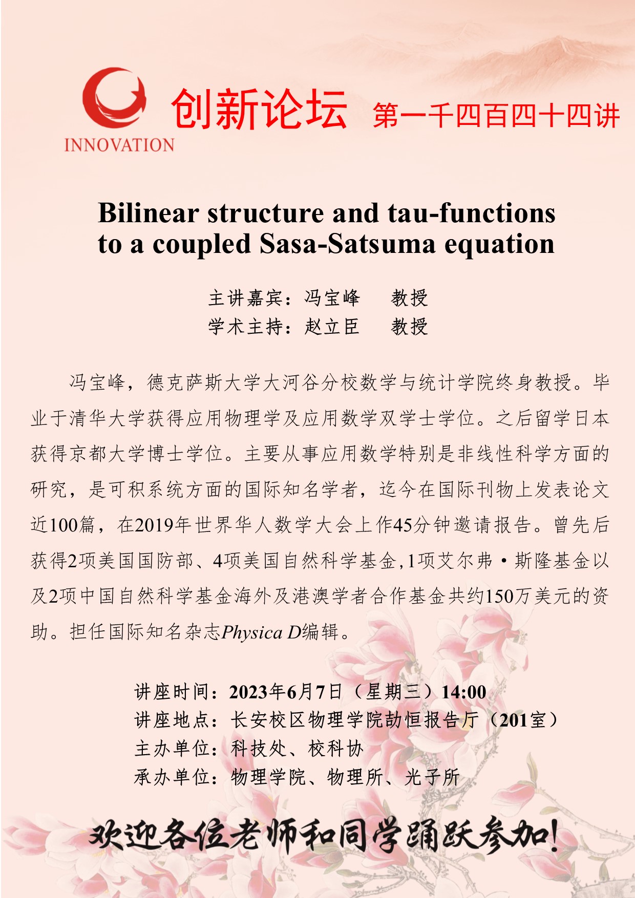 冯宝峰 教授 开云手机网页版登录入口创新论坛第一千四百四十四讲:Bilinear structure and tau-functions to a coupled Sasa-Satsuma equation 讲座时间 2023年6月7日(星期三)14:00 讲座地点 长安校区物理学院劼恒报告厅(201室) 讲座人介绍 冯宝峰 教授 讲座内容