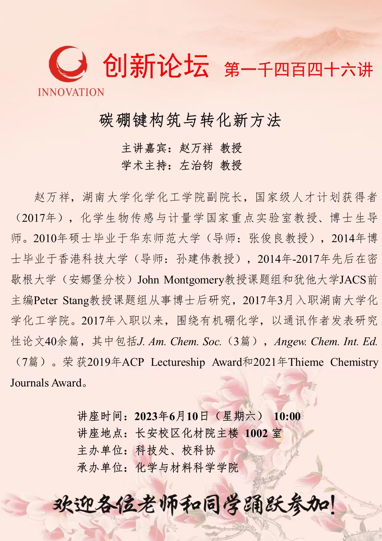 赵万祥 教授 开云手机网页版登录入口创新论坛第一千四百四十六讲:碳硼键构筑与转化新方法 讲座时间 2023年6月10日(星期六) 10:00 讲座地点 长安校区化材院主楼 1002 室 讲座人介绍 赵万祥 教授 讲座内容