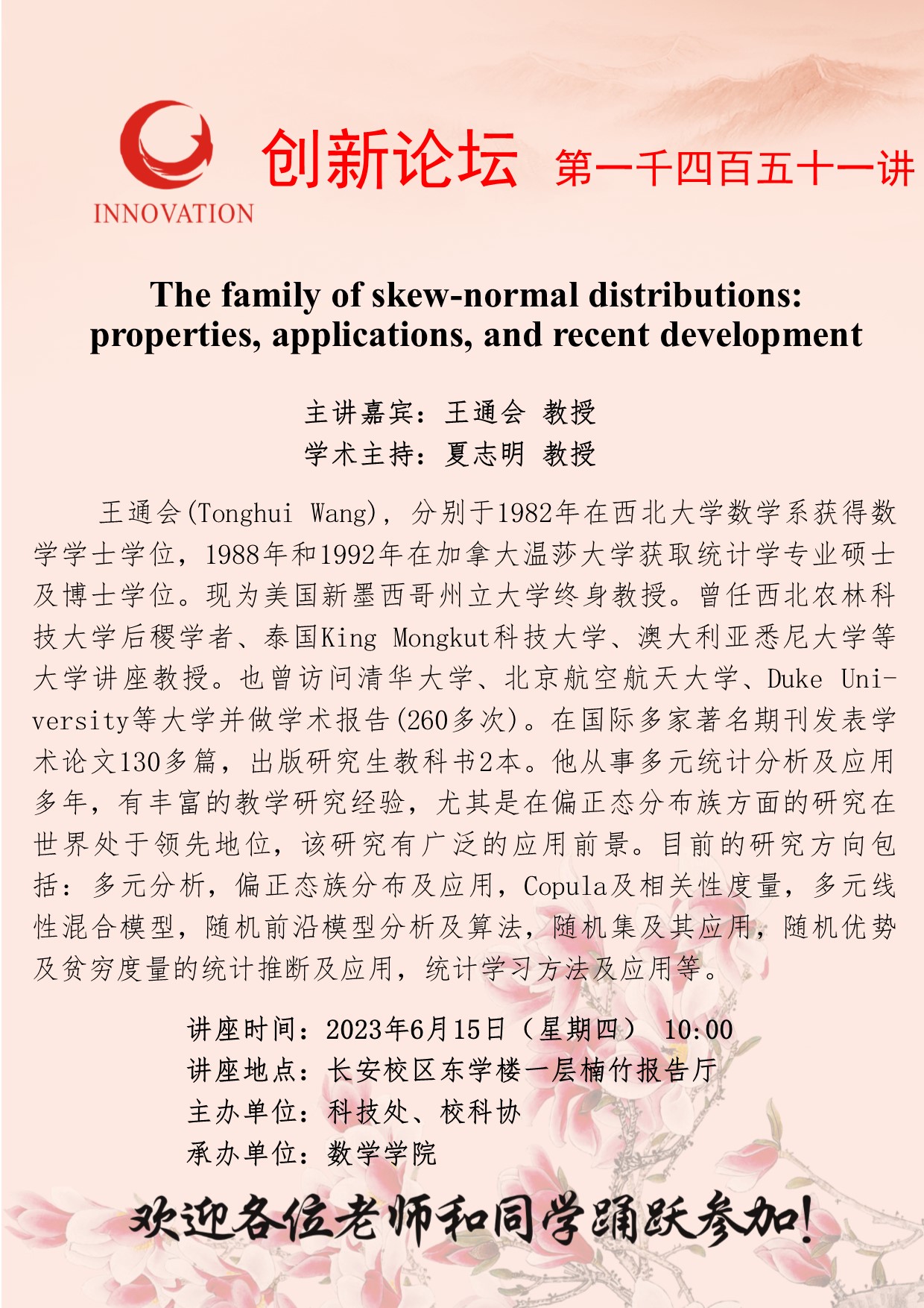 王通会 教授 开云手机网页版登录入口创新论坛第一千四百五十一讲:The family of skew-normal distributions: properties, applications, and recent development 讲座时间 2023年6月15日(星期四) 10:00 讲座地点 长安校区东学楼一层楠竹报告厅 讲座人介绍 王通会 教授 讲座内容