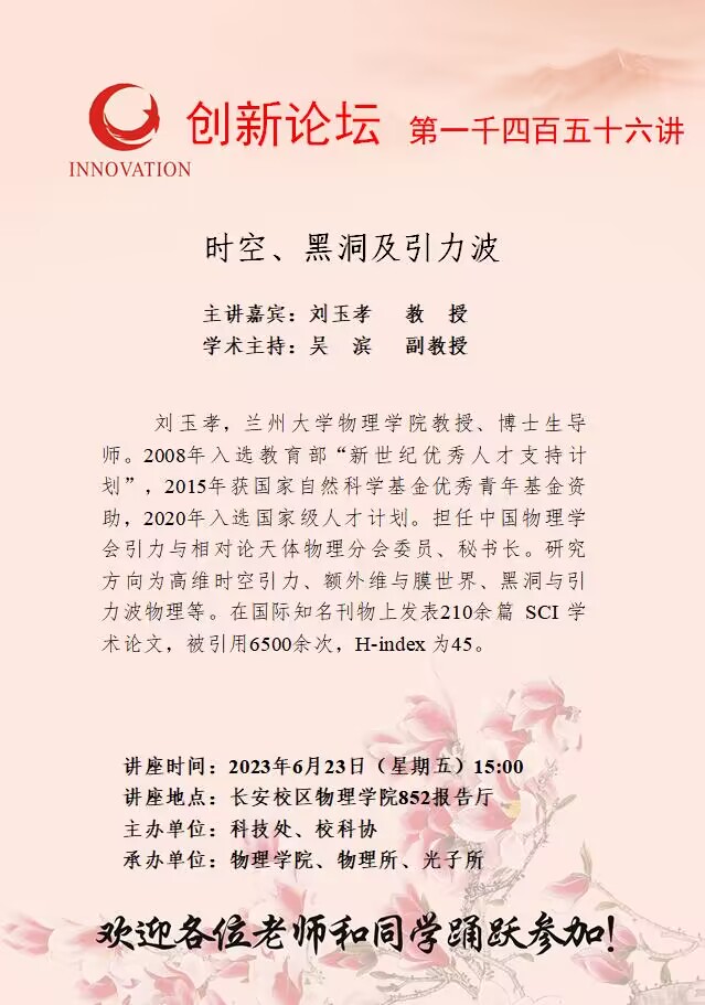 刘玉孝 教授 开云手机网页版登录入口创新论坛第一千四百五十六讲: 时空、黑洞及引力波 讲座时间 2023年6月23日(星期五)15:00 讲座地点 长安校区物理学院852报告厅 讲座人介绍 刘玉孝 教授 讲座内容