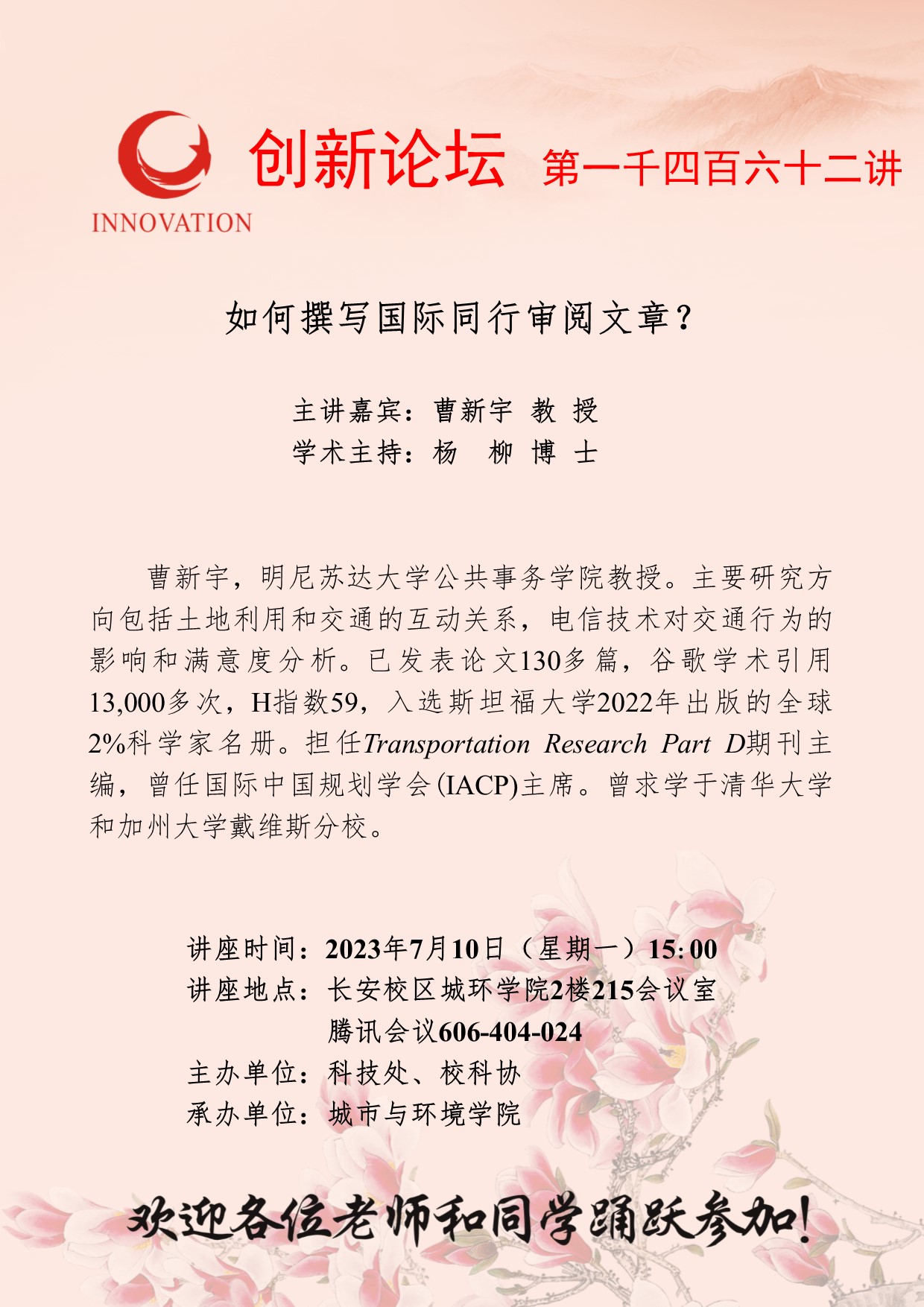 曹新宇 教授 开云手机网页版登录入口创新论坛第一千四百六十二讲:如何撰写国际同行审阅文章? 讲座时间 2023年7月10日(星期一)15:00 讲座地点 长安校区城环学院2楼215会议室 讲座人介绍 曹新宇 教授 讲座内容