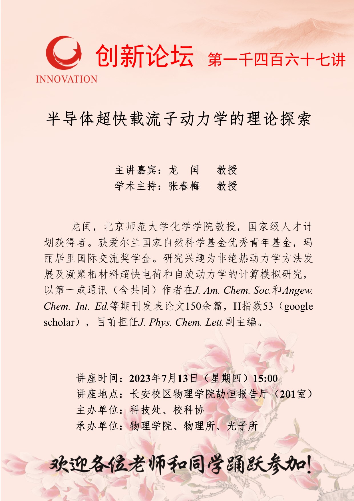 龙闰 教授 开云手机网页版登录入口创新论坛第一千四百六十七讲:半导体超快载流子动力学的理论探索 讲座时间 2023年7月13日(星期四)15:00 讲座地点 长安校区物理学院劼恒报告厅(201室) 讲座人介绍 龙闰 教授 讲座内容