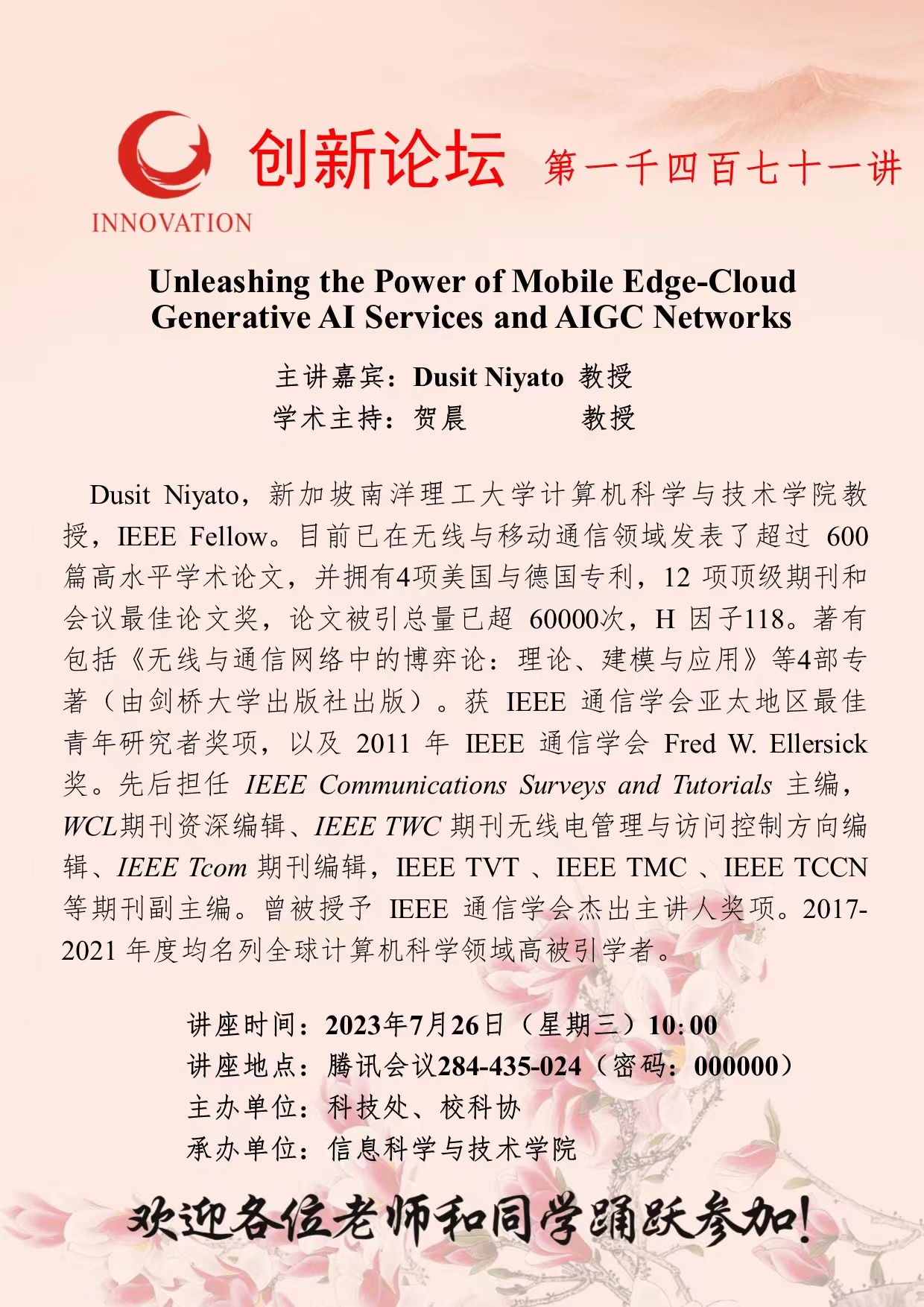 Dusit Niyato 教授 开云手机网页版登录入口创新论坛第一千四百七十一讲:Unleashing the Power of Mobile Edge-Cloud Generative AI Services and AIGC Networks 讲座时间 2023年7月26日(星期三)10:00 讲座地点 腾讯会议284-435-024(密码:000000) 讲座人介绍 Dusit Niyato 教授 讲座内容