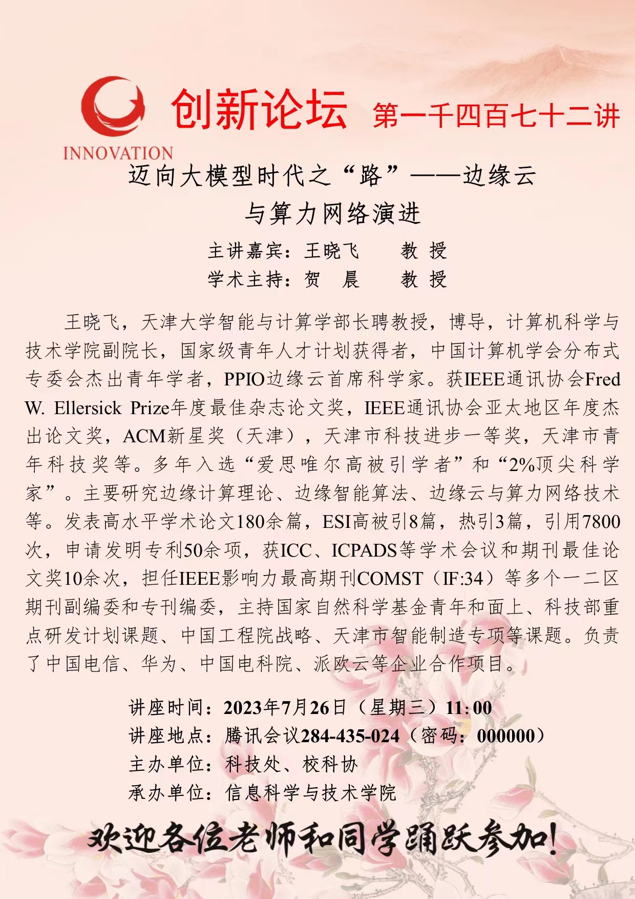 王晓飞 教授 开云手机网页版登录入口创新论坛第一千四百七十二讲:迈向大模型时代之“路”—边缘云与算力网络演进 讲座时间 2023年7月26日(星期三)11:00 讲座地点 腾讯会议284-435-024(密码:000000) 讲座人介绍 王晓飞 教授 讲座内容