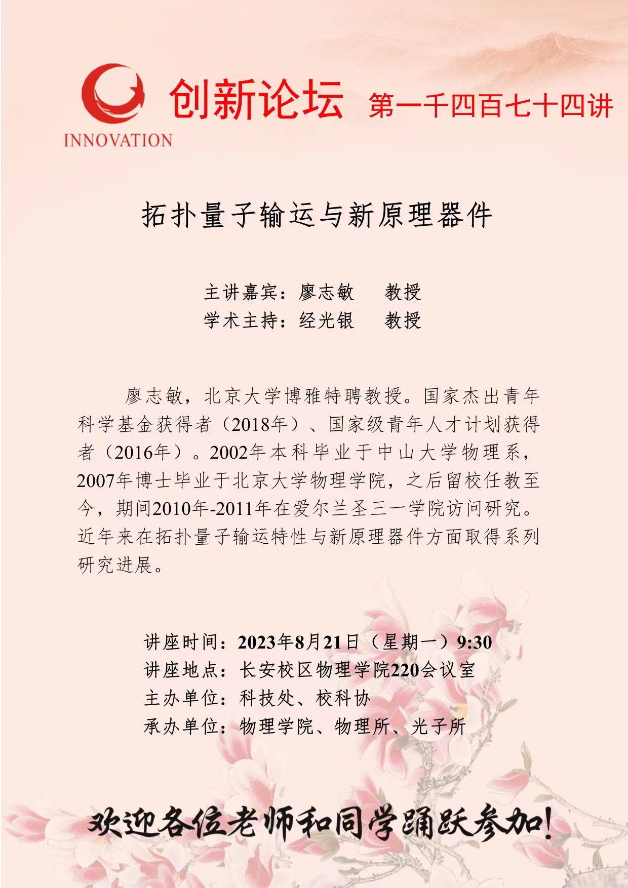 廖志敏 教授 开云手机网页版登录入口创新论坛第一千四百七十四讲:拓扑量子输运与新原理器件 讲座时间 2023年8月21日(星期一)9:30 讲座地点 长安校区物理学院220会议室 讲座人介绍 廖志敏 教授 讲座内容