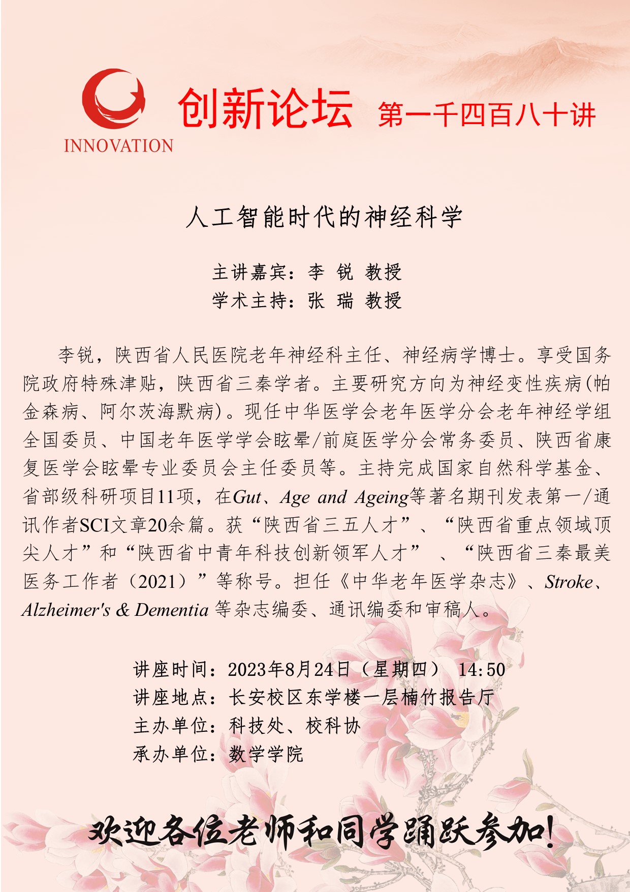 李 锐 教授 开云手机网页版登录入口创新论坛第一千四百八十讲:人工智能时代的神经科学 讲座时间 2023年8月24日(星期四) 14:50 讲座地点 长安校区东学楼一层楠竹报告厅 讲座人介绍 李 锐 教授 讲座内容