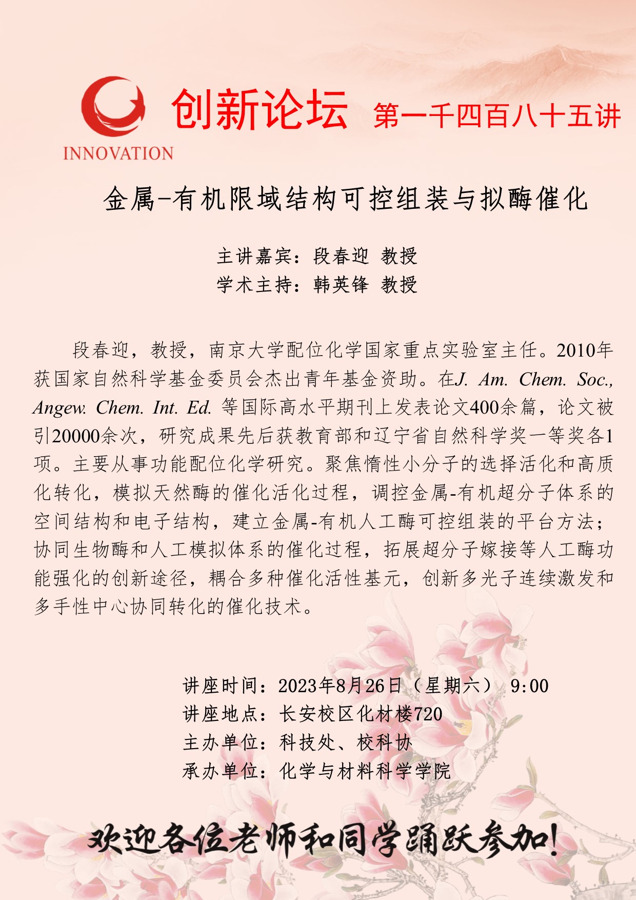 段春迎 教授 开云手机网页版登录入口创新论坛第一千四百八十五讲:金属-有机限域结构可控组装与拟酶催化 讲座时间 2023年8月26日(星期六) 9:00 讲座地点 长安校区化材楼720 讲座人介绍 段春迎 教授 讲座内容