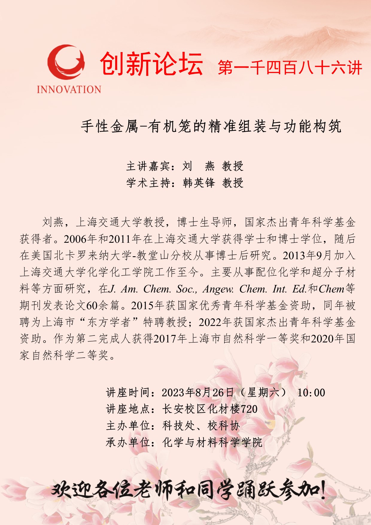 刘燕 教授 开云手机网页版登录入口创新论坛第一千四百八十六讲:手性金属-有机笼的精准组装与功能构筑 讲座时间 2023年8月26日(星期六) 10:00 讲座地点 长安校区化材楼720 讲座人介绍 刘燕 教授 讲座内容
