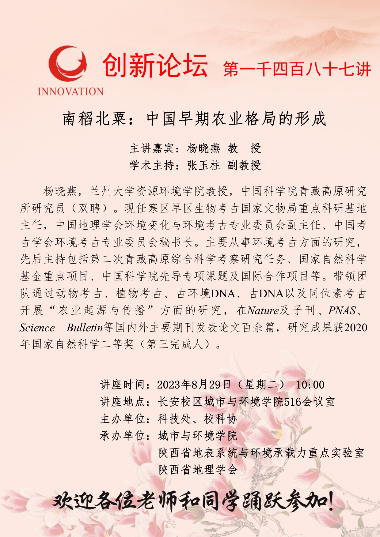杨晓燕 教授 开云手机网页版登录入口创新论坛第一千四百八十七讲:南稻北粟:中国早期农业格局的形成 讲座时间 2023年8月29日(星期二) 10:00 讲座地点 长安校区城市与环境学院516会议室 讲座人介绍 杨晓燕 教授 讲座内容