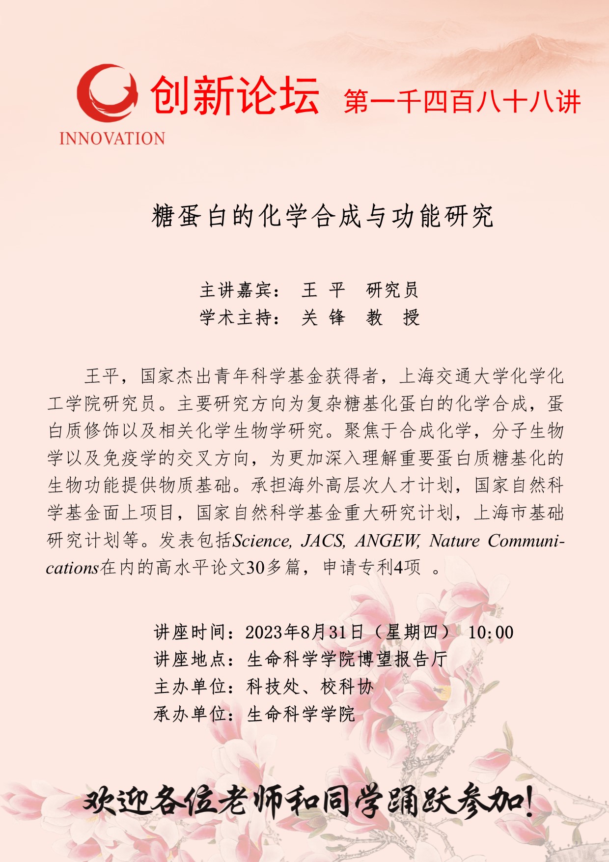 王平 研究员 开云手机网页版登录入口创新论坛第一千四百八十八讲:糖蛋白的化学合成与功能研究 讲座时间 2023年8月31日(星期四) 10:00 讲座地点 生命科学学院博望报告厅 讲座人介绍 王平 研究员 讲座内容